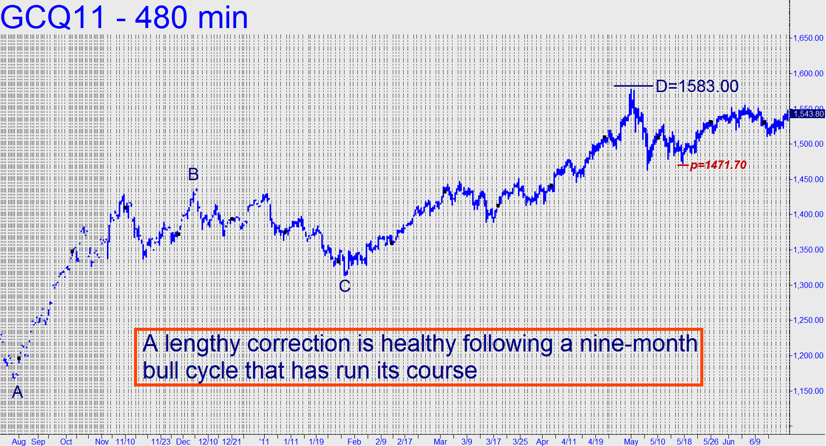 Unfurl August Gold’s 480-minute chart and you begin to understand why this now seven-week-old correction is taking its sweet old time. A clear bullish pattern projecting to 1582.70 took fully nine months to play out, culminating in an early-May spike that begged chastisement. We note as well that the actual high at 1577.70 fell $5 shy of the predicted top, auguring a period of penance more prolonged than we might have expected if the target had been reached or exceeded. The shortfall, slight though it was, will require us to pay particular attention to downtrending abcd correctionss, since bear markets typically begin with a missed rally target of intermediate degree.