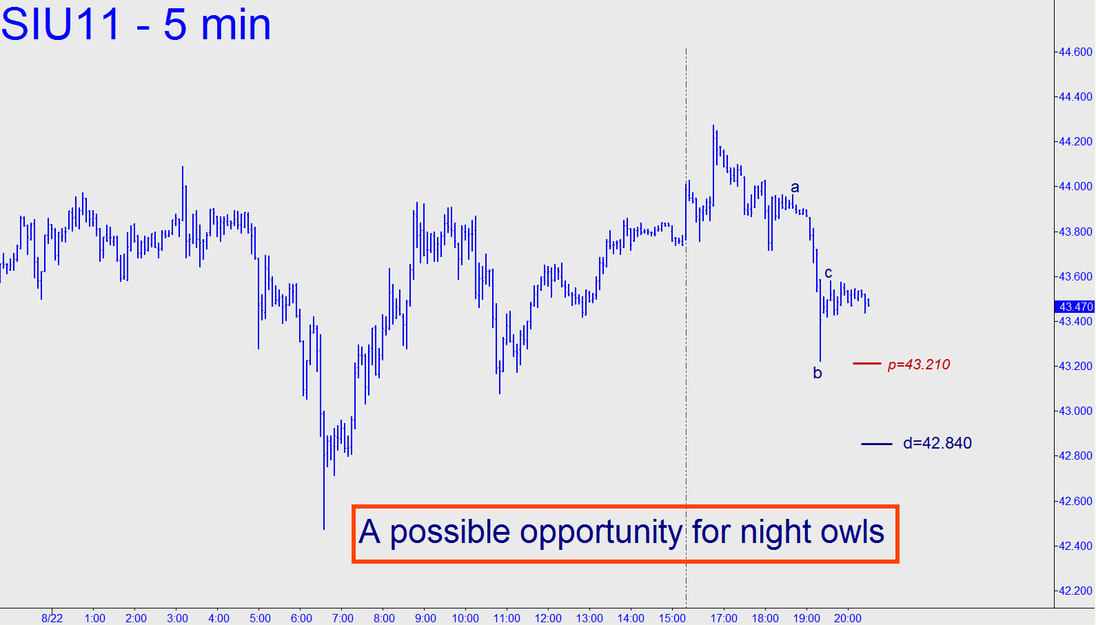 Silver got mired in a correction yesterday, evidently grown timid about following Gold’s aggressive lead. Even so, the choppy action penetrated a 43.795 midpoint resistance to the upside, presumably clearing the way for an easy shot at its ‘D’ sibling, 45.110. Night owls should consider bottom-fishing at the corrective midpoint shown, but please note that a downthrust that gets past the two labeled lows would create a bearish impulse leg of lesser degree (and also another possible buying opportunity at the ‘p’ midpoint or ‘d’ target of the pattern).