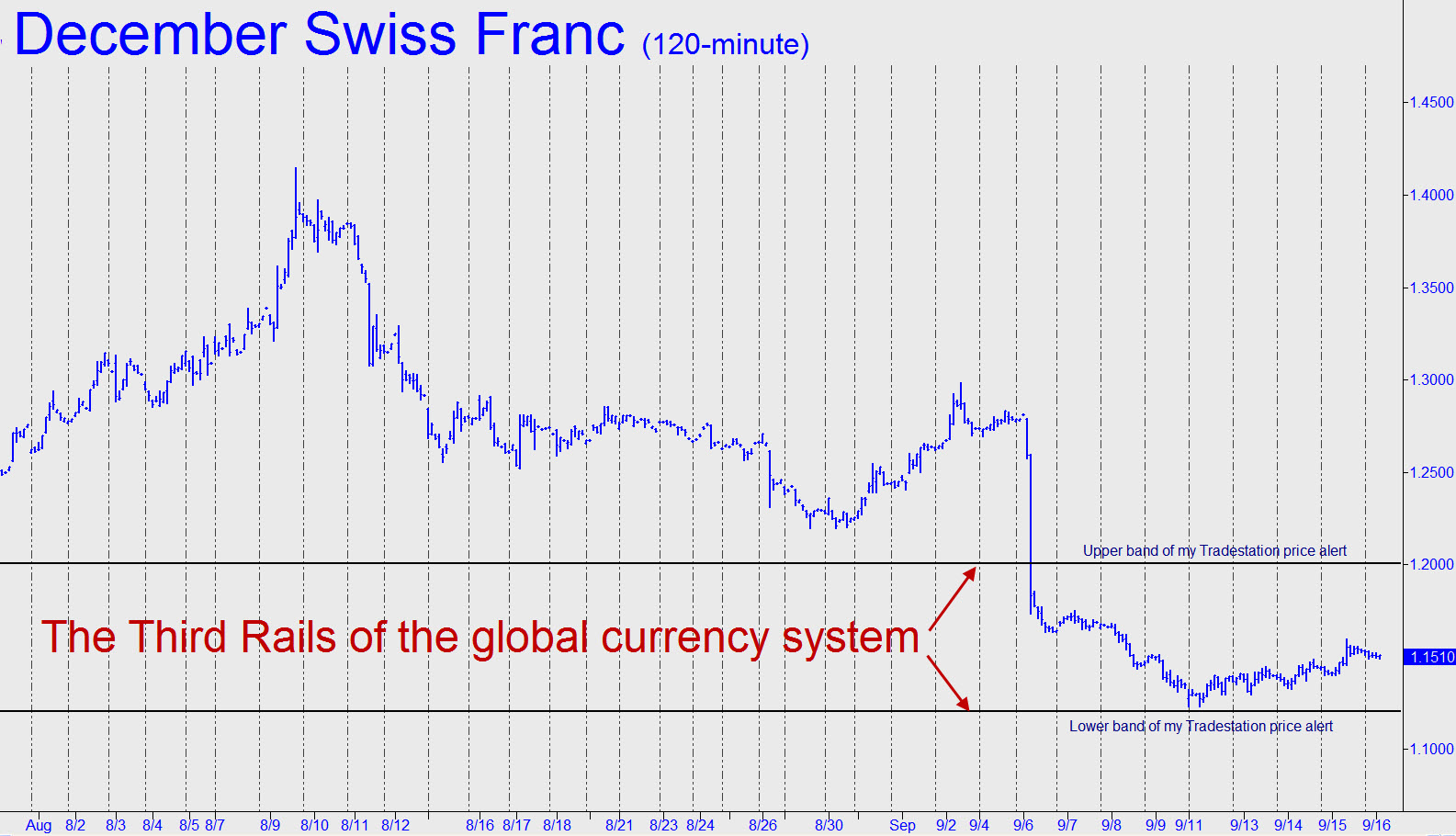 Are these guys good, or what? I set alerts a week ago above and below what I had assumed to be the “controlled zone” for the Swissie. Lo, the gnomes have barely let the futures budge. Surely they are having to resist a tide of buying that is counting on Burgher rectitude to prevent the Swiss franc from joining all of the other currencies on the dungheap of international finance? Whatever the case, the 120-minute chart is bullishly impulsive at its right-hand edge, so let’s sit back and enjoy world-class defensive play in the big leagues of fiat money. Want to learn how to nail swing highs and lows precisely, and to manage trade risk yourself? Click here for information about the upcoming Hidden Pivot Webinar on October 5-6 and a $50 discount.