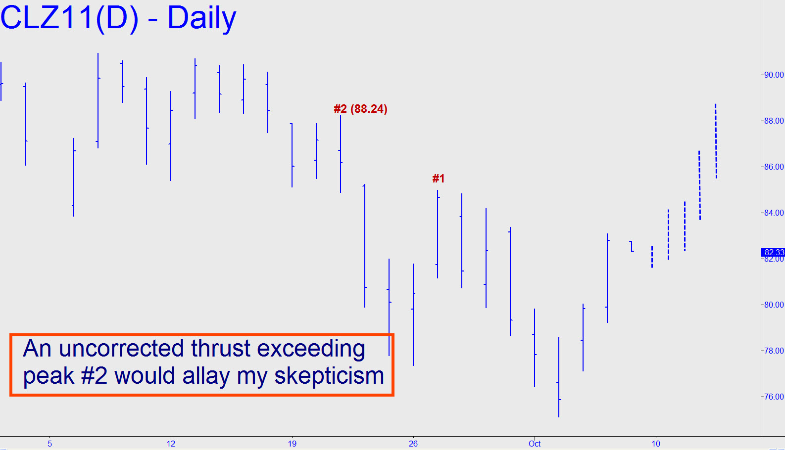 Yeah, I know you depend on me to not play hunches, but I can’t shake the gut feeling that this rally is just a dead-cat bounce. In any case, to reckon the odds in the coldly mechanical way that is our forte, we should remain skeptical unless the crime syndicate that is behind this squeeze can push the December contract, without taking a breather, above the 88.24 peak labeled in the chart. This is shown hypothetically in the chart.