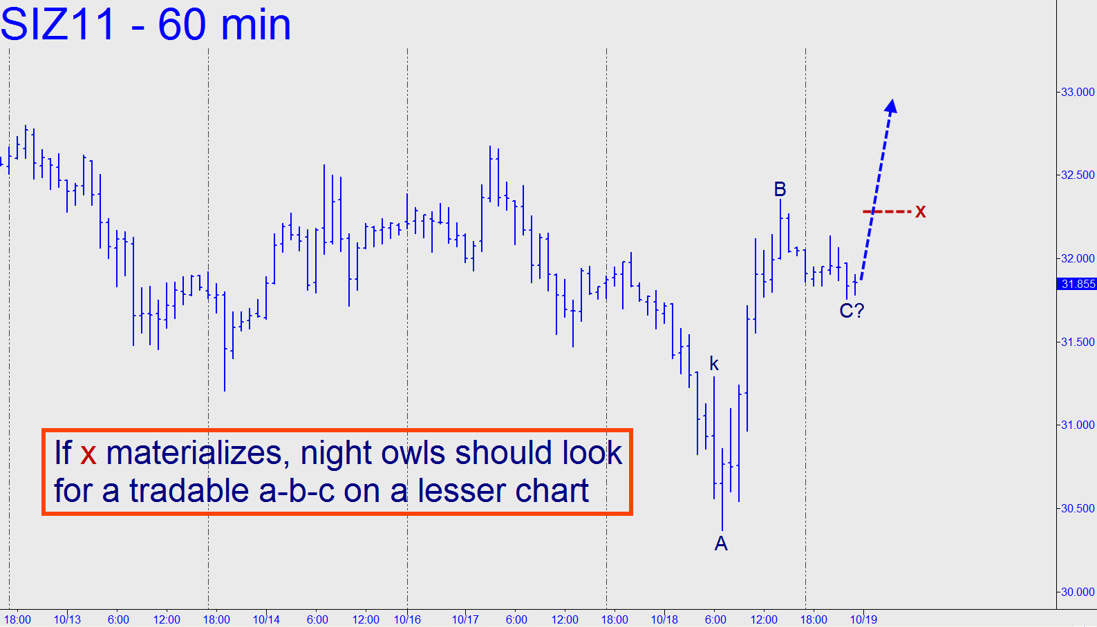 Caterwauling its way to nowhere, December Silver was mildly impulsive at the bell yesterday, then fully corrected by midnight. From the so-far overnight low at 31.760, it would take a 50-cent thrust to create the theoretical entry point for a pattern with the potential to reach 33.745. Night owls should continue to monitor the corrective b-c, and zoom down to the 5-minute chart for ‘camouflage’ if it gives way to an upthrust that engenders an ‘x’ entry point. I’ve sketched this out for your further guidance in the accompanying chart.