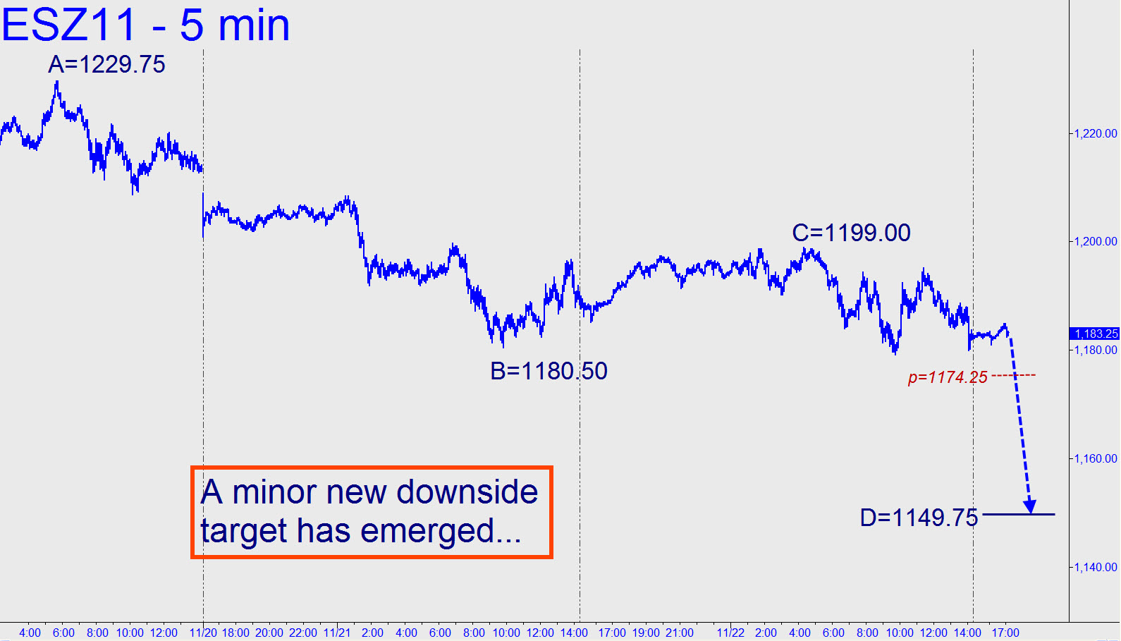 The 1199.50 Hidden Pivot proferred here yesterday came within half a point of nailing the intraday high and the start of a so-far 32-point selloff, but our head-fake target was too close to the very round 1200.00 to offer an ideal trading opportunity. None of this changes my expectation of a fall to at least 1152.25, but there’s another, more muted target at 1149.75 that you should consider if you are short, planning to get short, or thinking about bottom-fishing. Its provenance is shown in the chart accompanying this tout and will probably work best if the implied plunge occurs straightaway. ________ UPDATE (Friday, 12:11 a.m. EST)): A post-holiday collusion between institutional pond scum and short-covering halfwits has the Dow up by about 20 points at the moment, notwithstanding the grave implications of Europe’s imminent fall. Even though the slightly lower of my two targets was breached by just 2.25 points, that is sufficient to imply that the futures will be bound shortly for the 1015.50 ‘D’ target of a larger pattern (whose midpoint was 1152.25). Click here if you’d like to learn more about the Hidden Pivot Method, including how to identify and trade targets such as the ones given above, and to forecast trends with bold confidence.