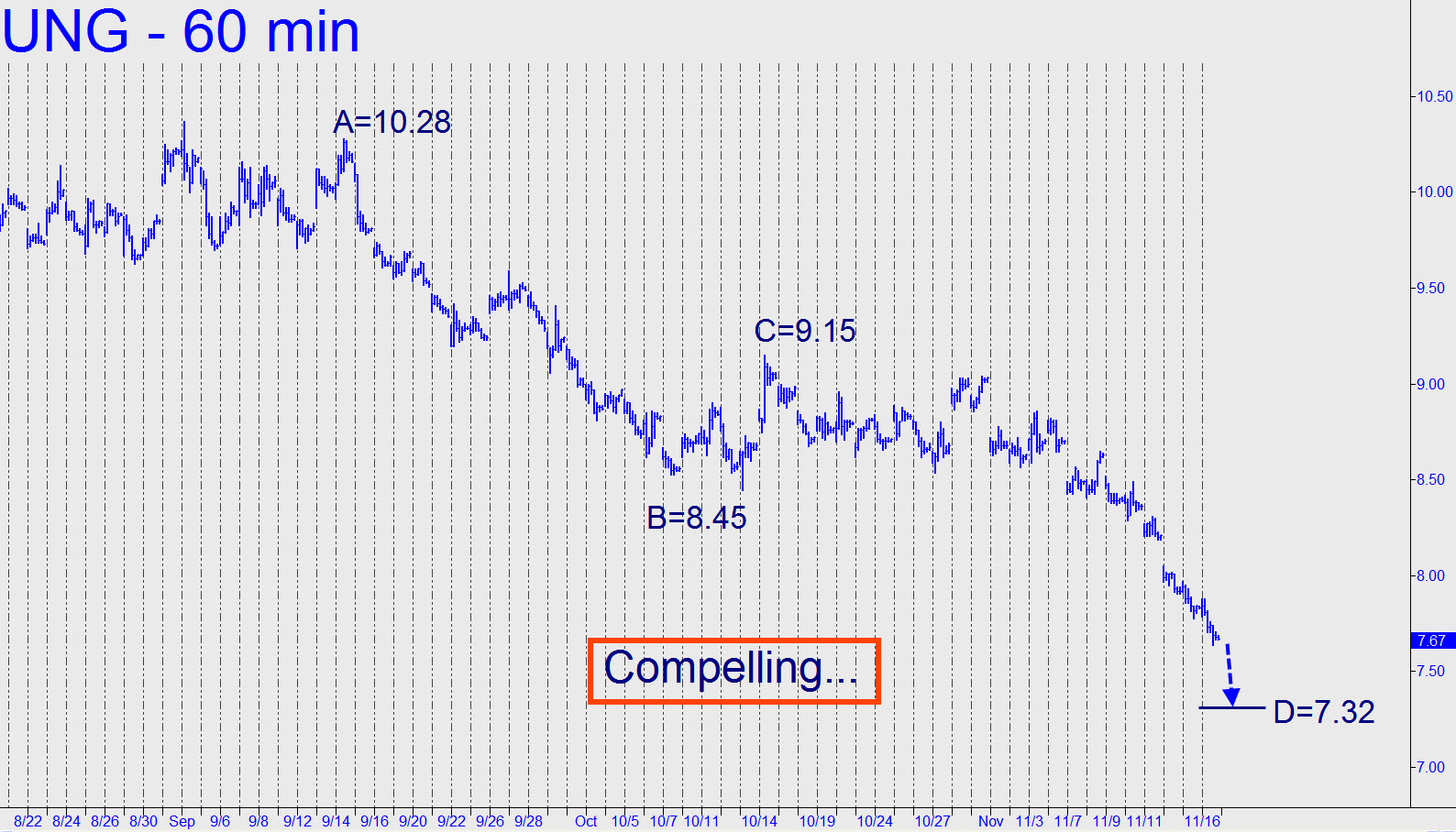 Traders could have caught a nice ride yesterday from an interim low at 3.387, since it fell within 0.003 points of a Hidden Pivot support flagged in the chat room by ‘Pivoteer’ and amplified in my tout. The subsequent bounce would have been worth as much as $500 per contract if you’d exited before the futures relapsed down to a so-far low of 3.325 Wednesday night. That’s a penny beneath my worst-case bottom, but I still expect a major rally from very near these levels, so camouflageurs are advised to remain diligent. I’ll suggest using the 5-minute chart, since the bars are very thin if you go any lower. If you’d prefer to use UNG, the NatGas ETF, the 7.32 pivot given here yesterday is still the place to look for a tradable turn. ______ UPDATE (11:35 a.m. EST): A ‘camo’ pattern launched at 4:50 a.m. from 3.341 would have triggered a long from 3.386. Half of a four-contract position would have been exited at the ‘p’ midpoint of the pattern, 3.401, and a third contract at 3.430, the ‘D’ target. The remaining contract, adjusted for theoretical gains thus far of 7.50 cents, has an effective cost basis of 3.311. Let it ride for now with a fixed stop at 3.345.