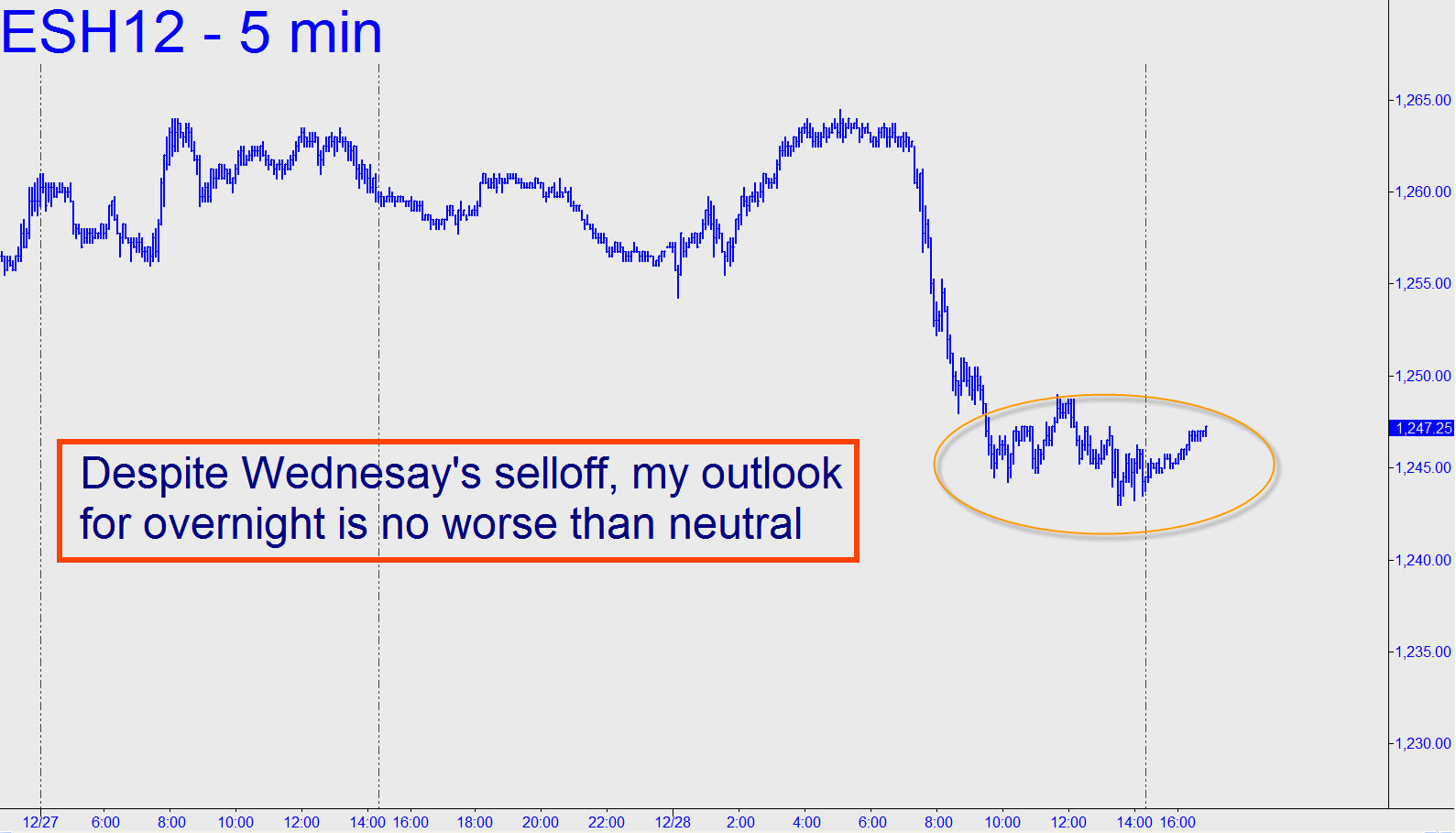 There appears to be zero buying interest at the moment, since the futures have been unable to achieve even the modest yardage needed to turn the daily chart impulsively bullish. Yesterday this weakness was evident in the failure of the futures for the second straight day to surpass the 1266.00 high recorded on December 8. Still, bullish buyers are not needed to drive the market sharply higher — only short-covering bears. The “news” that will catalyze this hysteria is impossible to predict, but until it comes we can only continue to mark time by nibbling on ‘camo’ buying opportunities as it suits us. Yesterday, however, index futures were easier to short — and so we did during the weekly tutorial session. For Wednesday night, a mixed technical picture suggests there will be action only for nimble scalpers. Despite Wednesday’s selloff, however, my outlook for overnight is no worse than neutral.