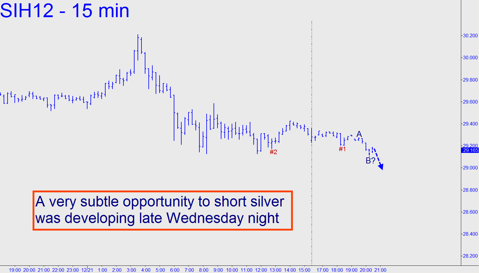 A bottom-fishing setup similar to the one I’ve featured in today’s gold tout is where night owls should look for action. The ‘p’ midpoint where you can attempt it lies at 29.045, and you may use either camouflage, or more dangerously a three-tick stop-loss. The futures would be signaling further distress over the near-term down to as low as 28.505 if the midpoint support is easily breached. If you’d prefer trying to short this vehicle, the 15-minute chart holds some enticing possibilities. Check out the inset if you want to see a subtle one that was developing shortly before 10 p.m. EST. _______ UPDATE (1:59 a.m. EST): The midpoint bounce we were expecting came at 10:00 p.m. from a single tick above the 29.045 pivot, so officially –and by a hair — we did nothing. The 15-cent rally that ensued would have more than covered the three-tick stop-loss, but it was not to be. The futures subsequently relapsed to a so-far low tonight of 29.010, but there was no reason to have looked for ‘camo’ opportunities, since that number is Nowheresville relative to the 28.785 ‘D’ target tied to the one-off ‘A’ shown (though not labeled) in the chart.