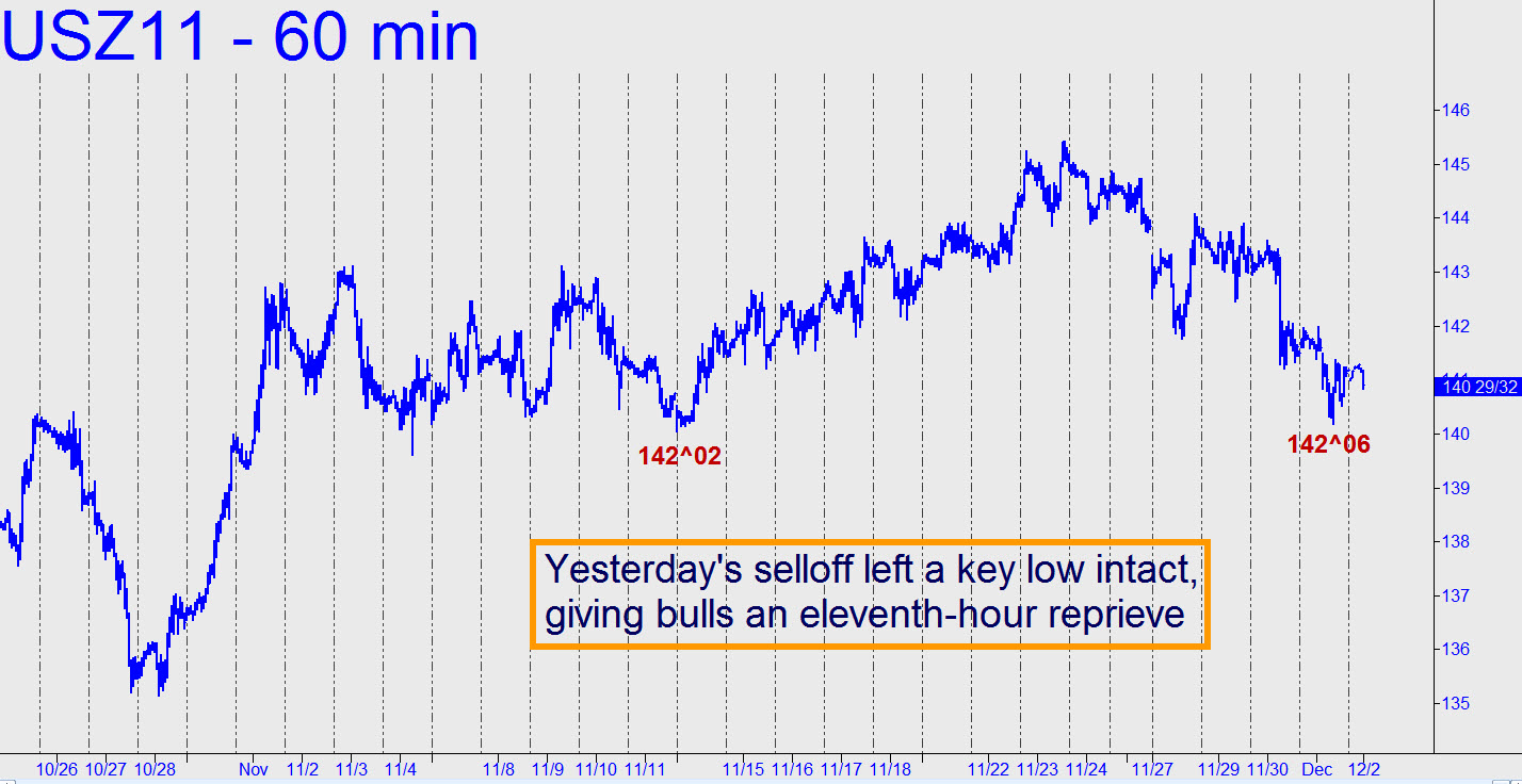 The 140^14 correction target drum-rolled here yesterday has been exceeded by eight ticks, or a quarter of a point. Ordinarily, because the pattern associated with that target is so clear, we might infer from even so small an overshoot s that significantly lower prices impend. In this case, however, we’ll reserve judgment for now, since there was an important low at 140^02 (November 13)  helping to pull the futures down.  Which is to say, the “magnetic” attraction of that low overpowered the Hidden Pivot support.  Now, the  December contract would need to hit 142^04 today to get out of immediate jeopardy, since that’s what it would take to generate a bullish impulse leg on the hourly chart.