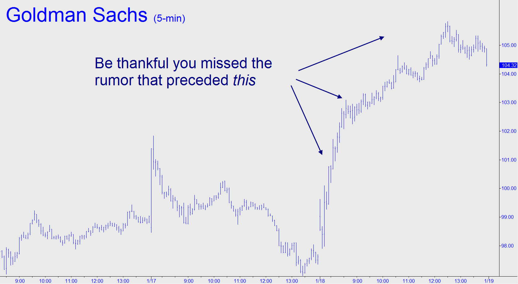 Hey, I’ve got a hot tip: Run the other way when some tipster wants to share a piece of juicy insider information with you. What would you have done if he’d told you earlier in the week that the notoriously well-connected banking firm was about to report horrendous earnings for the fourth quarter? You’d have jumped on some put options, right? Maybe a dozen or two March 95s, which were selling for around 3.50 with the stock loitering suspiciously near $98 on Tuesday. Guess what: The tipster got it exactly right. Goldman’s earnings could hardly have been much worse — down 58 percent for Q4. As for the March 95 puts, does an instant double to $7.00 sound about right? In fact, they traded for as little as 92 cents yesterday, having shed three-quarters of their value in just a few short hours as the stock soared almost $10 from the previous day’s low.