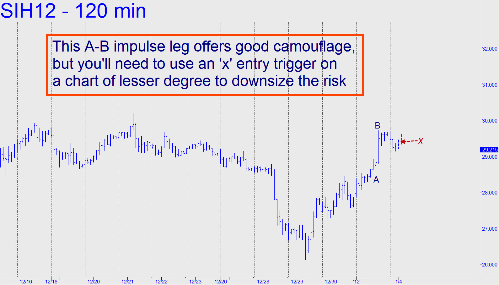 Unlike February Gold, this vehicle is within easy distance of negating a target 40 cents below the recent bottom at 26.145. However, a much lower target at 18.355 is still in play, and we also need to take into account that the rally so far is not especially impressive considering that it was catalyzed by a viciously false breakdown beneath September’s neon low, 26.185. On balance, we can trade the minor rallies but use tight stops. Just such an opportunity could unfold Tuesday night or Wednesday based on the pattern shown. The implied entry risk would be $1500 per contract on the 120-min chart (25% of A-B x $50/1 cent), so you’ll need to zoom down to a chart (end entry pattern) of lesser degree when the big-pattern ‘X’ is about to trigger. _______ UPDATE (3:11 a.m. EST): A pattern very similar to the one I sketched triggered a 29.410 ‘X’ entry signal at around 2:10 a.m., but executing the trade on the 1-minute chart would have produced an unacceptably large loss of 2.5 cents per contract, or $125. Entry would have come off the pattern A=29.400 (2:47 a.m.); B=29.465 (2:48 a.m.), C=29.435 and X=29.455. A lower, second point ‘C’ at 29.420 (2:53 a.m.) yielded a solid winner that would still be live, but strictly speaking, ‘camo’ trades should work on the first try or we don’t do them. The next valid entry opportunity — and winning trade — would have come at X=29.495 (3:00 a.m.), but I’ll let you discover the details so that you can learn from them. Swimming with the sharks in the wee hours needn’t be scary. If you’re a night owl looking to make the most of the excellent opportunities that frequently occur when most traders are asleep, click here.