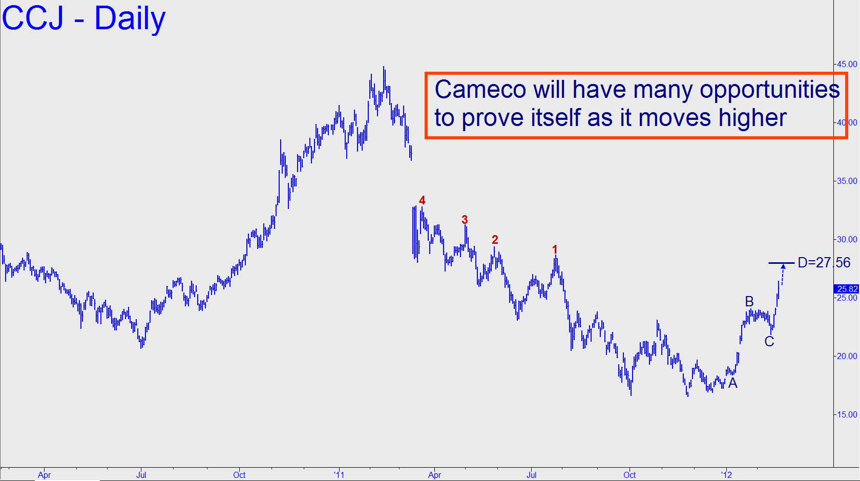 It’s been a long while since we looked in on this stock, but its ballistic rally of late warrants a timely update. While Cameco’s long dirge appears, finally, to have ended, the stock’s ability to hurdle a series of ‘external’ peaks tracing back nearly a year can tell us how far it might travel relative to the bull market peak near 45 from last February. For now, we’ll judge buyers’ mettle according to how well they handle the 27.56 Hidden Pivot target of the pattern shown. The stock is a cinch to get there, but it will need to get past the resistance within no more than a day or two of first touching it before we infer that there is power enough to drive the rally significantly higher in the months ahead. Would you like to learn how we use the ‘camouflage’ trading technique to significantly reduce entry risk? Click here for details.
