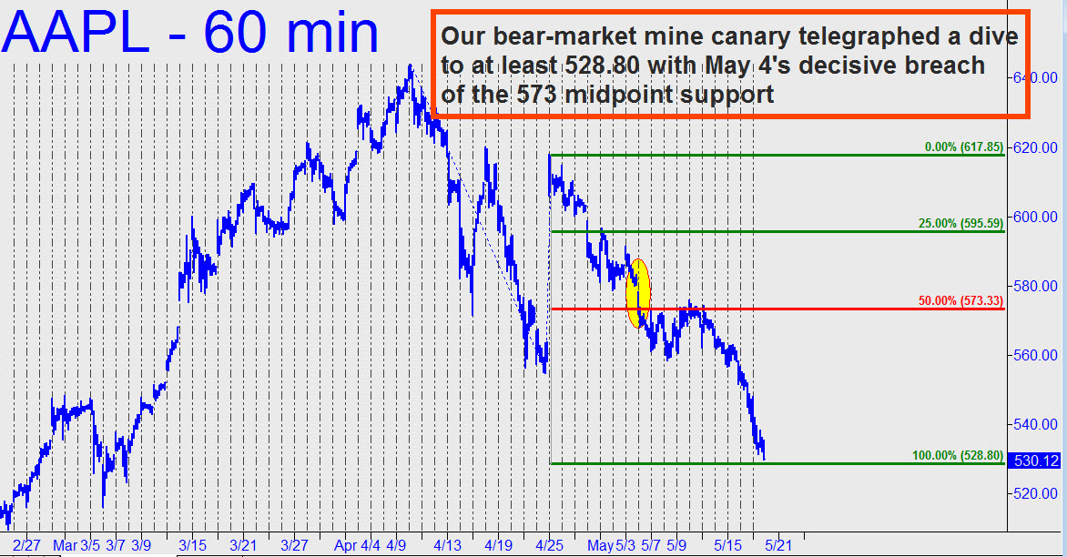 How’s this possible bear market working out for you, Mr. Apple? The chart is the same one that I featured here ten days ago, when the stock was $40 higher. Now, the target at 528.80 is just inches away, telegraphed by the earnest selling that took the stock through the 573 midpoint support exactly two weeks ago on the opening bar.