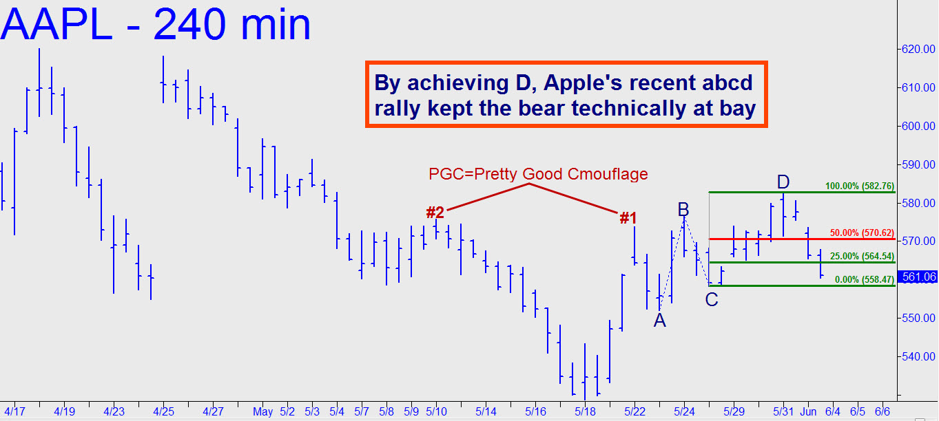 It’s time we looked in on our favorite bellwether, Apple, which is arguably acting like a world-beating company whose shares have entered a bear market. We shouldn’t be too hasty in ruling a TKO, though, at least not yet, since the stock did precisely achieve the ‘D’ target of its most recent corrective rally. As you can see, despite the stock’s occasionally wicked volatility, Apple can be quite obedient when confronted by a good, clear Hidden Pivot. Notice as well that although the correction provided a superbly camouflaged breakout and three single-bar coordinates, the trade would have been hard to execute because the little sonofabitch gapped through the ‘x’ entry point.