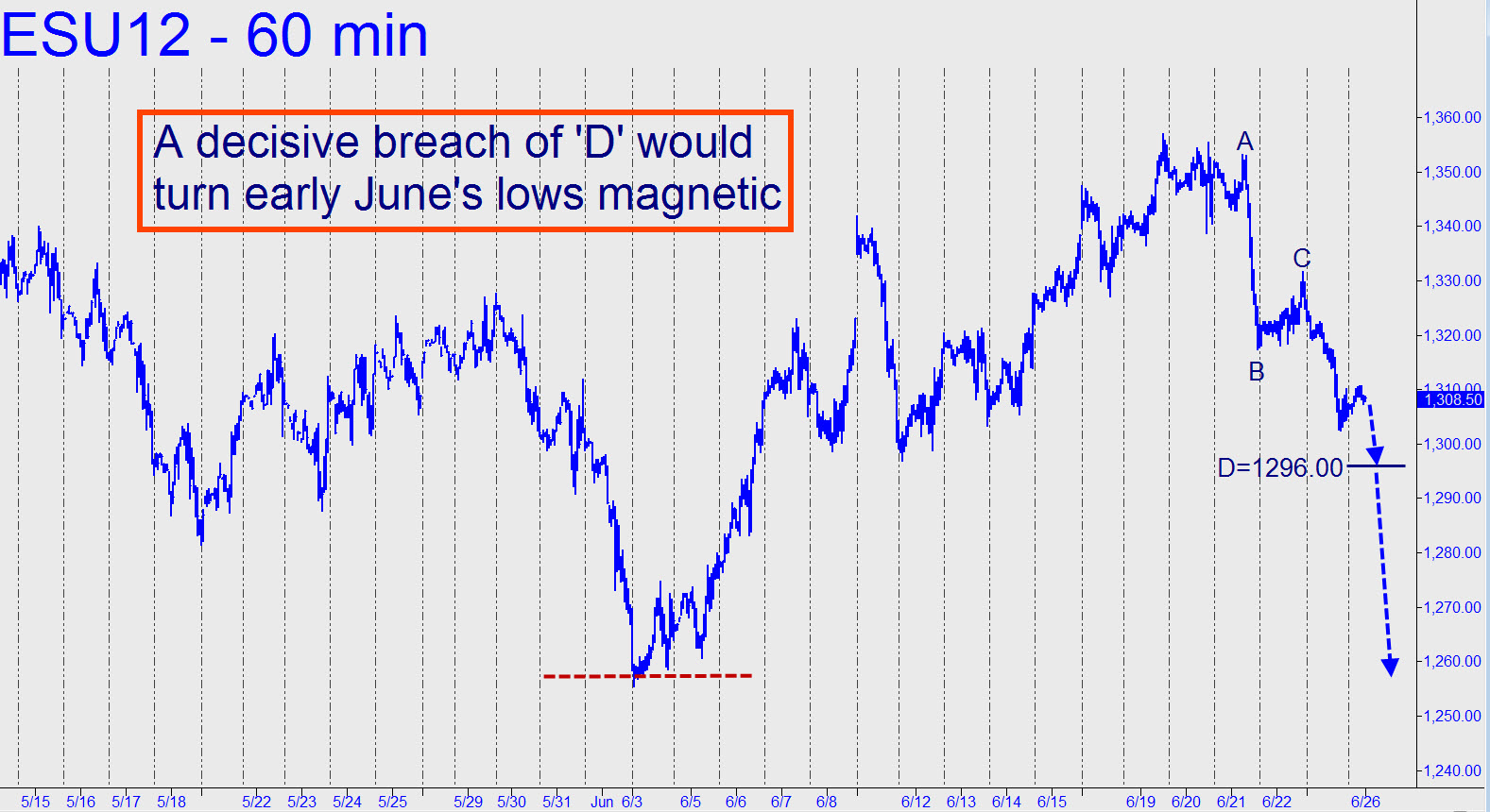 Yesterday’s plunge somehow avoided the finale of its projected fall to a 1296.25 target, but that could be remedied shortly. In any case, a rally back up to the 1314.00 midpoint would be a short — one to be initiated via camouflage, as is our practice whenever we leverage midpoint supports and resistances for trading purposes. If 1296.25 should fail as support, you can put Hidden Pivots aside and assume that a test of early June’s lows near 1260.00 impends. _______ UPDATE (11:24 a.m. EDT): The futures rallied precisely to 1314.00. Since a chat-roomer reported initiating a short there, I’m going to establish a tracking position for your further guidance, that assumes an initial position of four contracts. If you haven’t taken a profit yet, do so now at around 1306.50. Tie the remaining two contracts to a stop-loss at 1316.25. _______ UPDATE (2:27 p.m.): We exited on the stop-loss for a theoretical gain of perhaps $250/contract. We’ll continue to look aggressively for opportunities to get short in this presumptive bear market because: 1) we can, usually painlessly even when we are “wrong”; and 2) we don’t want to miss the avalanche when it comes, as it surely will.