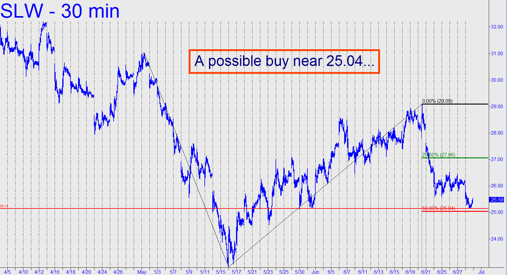 During Wednesday’s tutorial session, we discovered a possible buying opportunity in this stock without having looked for it. I’d suggested using the 25.04 midpoint support shown to get long with a tight stop-loss. However, because the low of yesterday’s nasty plunge only came down to 25.15 before the stock rallied out of the hole, it never triggered the screen alert I’d set. Under the circumstances, I’ll recommend picking a ‘camo’ entry spot on the 3-minute chart. The best potential opportunity I can discern would follow a b-c pullback from between two peaks that lie, respectively, at 25.54 (12:15 p.m. EDT) and 25.57 (11:30 a.m.). _______ UPDATE (11:37 a.m. EDT): Today’s surreal rally was over on the first bar, an untradable gap-up opening to 26.84. We did nothing. You can learn how to do this stuff yourself, and it’s not that hard! Click here if you’re ready to look at charts — and managing the risk of a trade — in a radical new way.