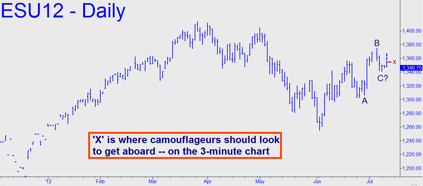 Monday’s tired action changed nothing in the immediate forecast. From a technical standpoint, it merely extended a B-C correction that is capable of launching a rally to 1404.00. If you’re looking for a way to get long, I’d drop down to the three-minute chart when the ‘x’ trigger shown gets hit. An alternative for night owls would be to attempt it on the 5-minute chart, were a promising abc uptrend was developing in subtle fashion arpund 5:45 p.m. EDT. Want to learn how to do this stuff yourself? Click here for a free trial subscription to Rick’s Picks.