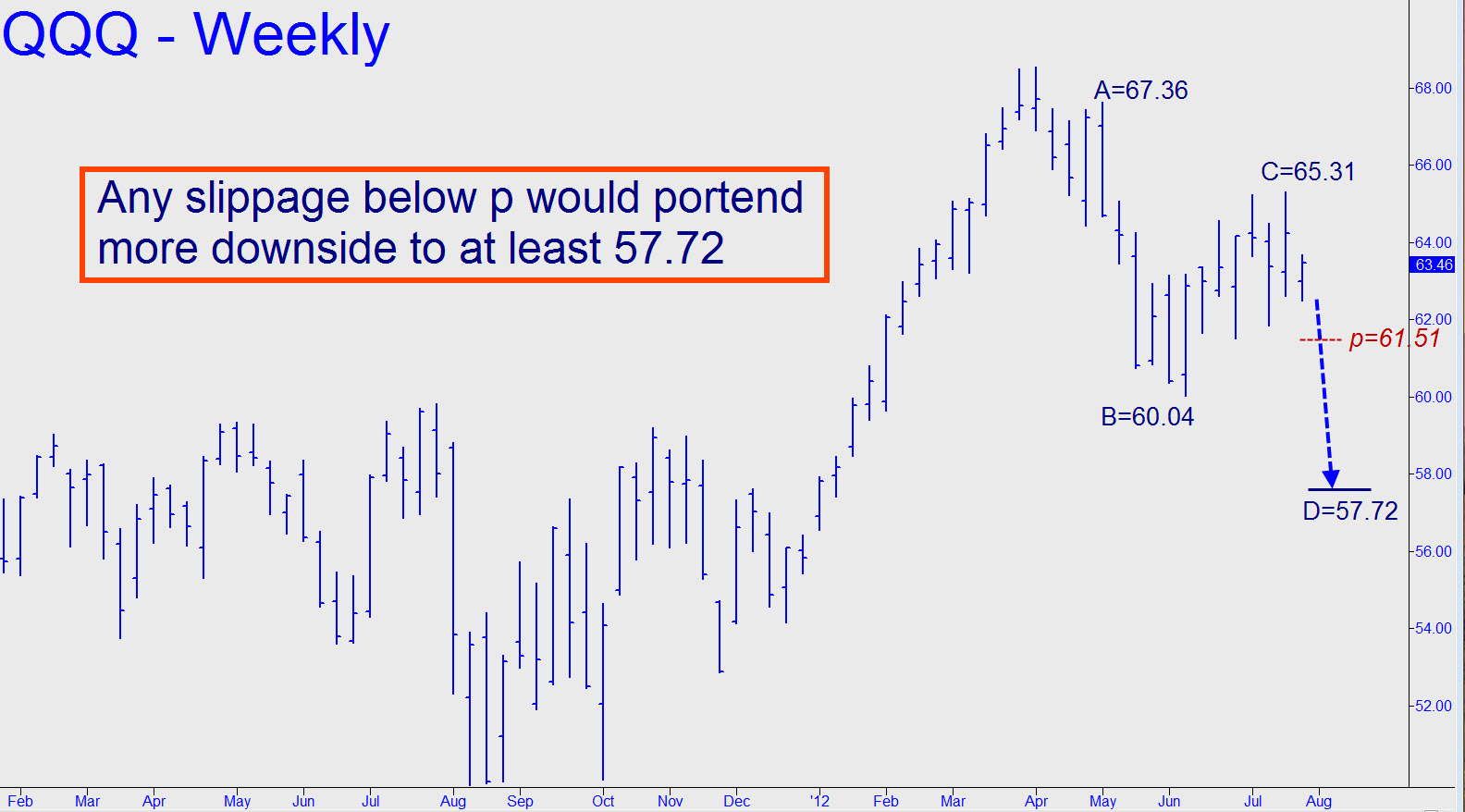 Using trailing stops disseminated in the chat room, ‘Crusty Buttocks’ has closed out half of a short position entered near the recent top at 65.26. His profits on the trade amount to $431 so far, effectively raising the cost basis of the shares we are still short to 67.41. His last post in the chat room advised a 65.26 stop-loss, but you should stay tuned intraday in case he adjusts the stop. FYI, if this vehicle falls to a midpoint support on the weekly chart that’s equivalent to the one at 1301.25 that I’ve flagged in the E-Mini S&P, it’s bound for a minimum 61.51 (see inset). _______ UPDATE (July 25, 3:11 a.m. EDT): In an update from Crusty posted Tuesday morning in the chat room, he has kept 200 shares — half tied to a 65.26 stop-loss, the other half stopped at 67.64. His cost basis for the short is 67.41, making it very hard to lose. _______ UPDATE (July 26, 10:19 p.m. EDT): Looks like Mr. Buttocks is holding a winning ticket, even if it turns out that the top he shorted was not the ever-elusive Major Top. Even after yesterday’s ferocious rally against his position, he’s still up $800 on paper. Not bad for being “wrong”! _______ UPDATE (July 30): With the market in the throes of a vicious rally, Crusty exited the last 25% of the short position on a 65.26 stop-loss. This he duly announced in the chat room at 9:37 a.m. His actual reported profit on the trade was $500. As of August 7, the QQQs appeared bound for a possible top — tradable via camouflage, in any case — at 67.07.