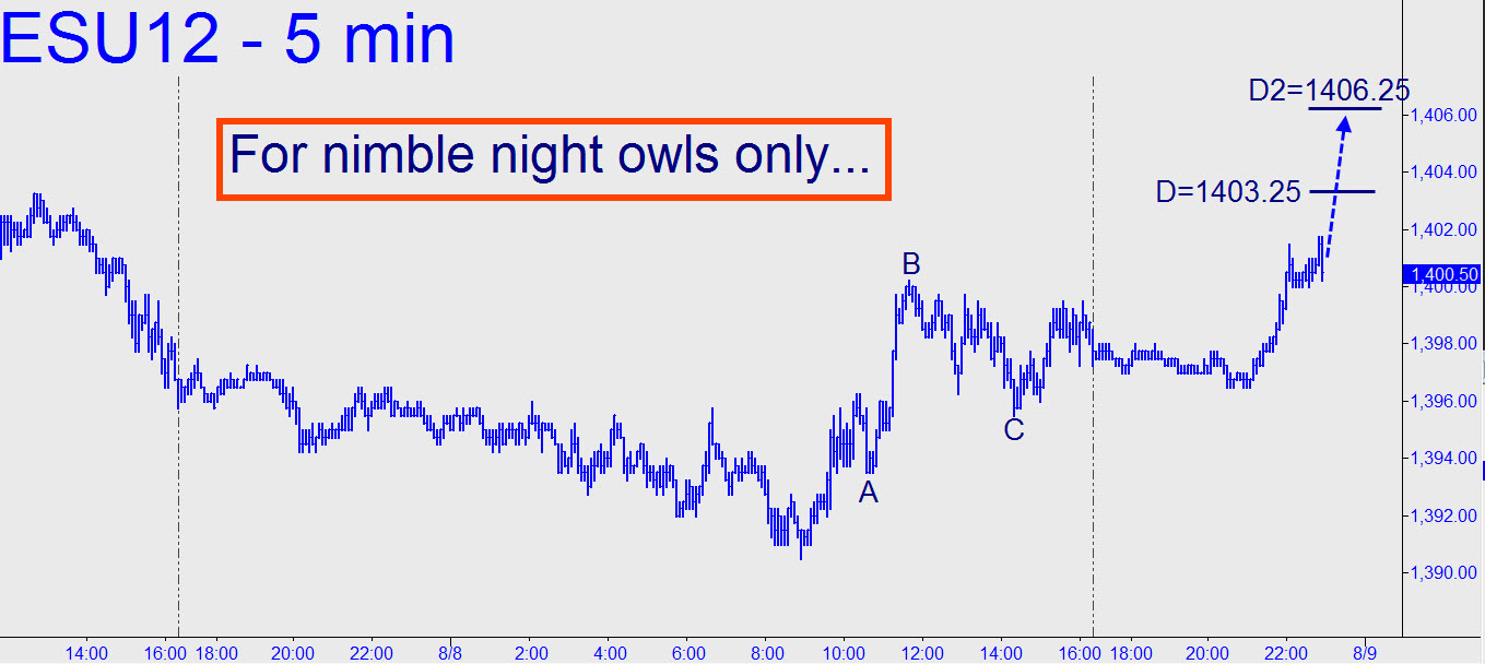 Yesterday’s projection caught the intraday low, 1390.50, precisely-to-the-tick. However, I’m not following through with tracking guidance because even though I’d suggested getting long down there, no one confirmed having done the trade in the chat room. Early Thursday morning, the rally was close to the 1403.25 target shown, but if it’s exceeded the 1406.25 ‘D’ Hidden Pivot of the even larger pattern shown will be in play. These numbers are tradable only by the very nimble, and so I’ll leave it to camouflage-equipped night owls to find a way aboard if the opportunity should arise.