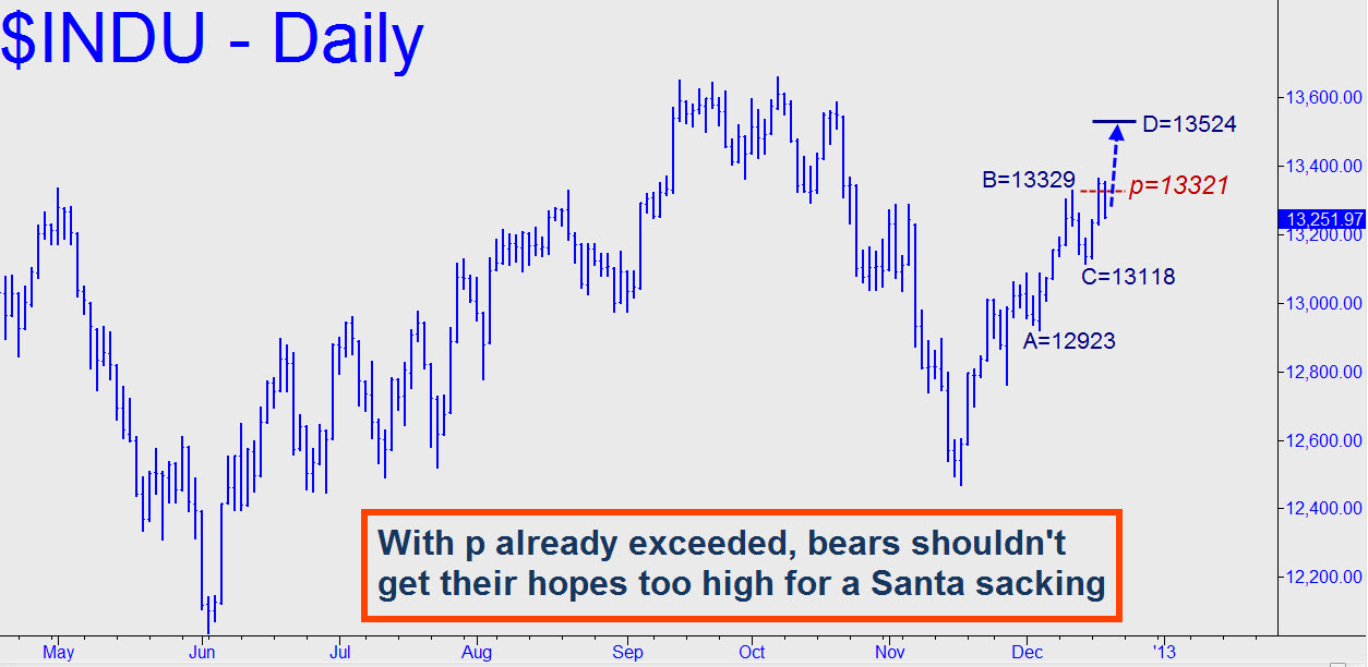 We were briefly short the Diamonds earlier this week, but with that petty distraction out of the way it’s a good time to look at the cash Dow disinterestedly. It sold off 100 points yesterday, but bears shouldn’t get their miserable hopes too high, since the recent top easily exceeded the 13321 midpoint resistance of a bullish pattern that projects to 13524 (see inset). That last number affords DaBoyz plenty of running room for a one- or two-day romp, and you should hold that in mind, along with a bullish bias, in the days ahead. You can learn to do this stuff yourself, and it’s easier than you might think. Click here for details — and a $50 discount coupon.