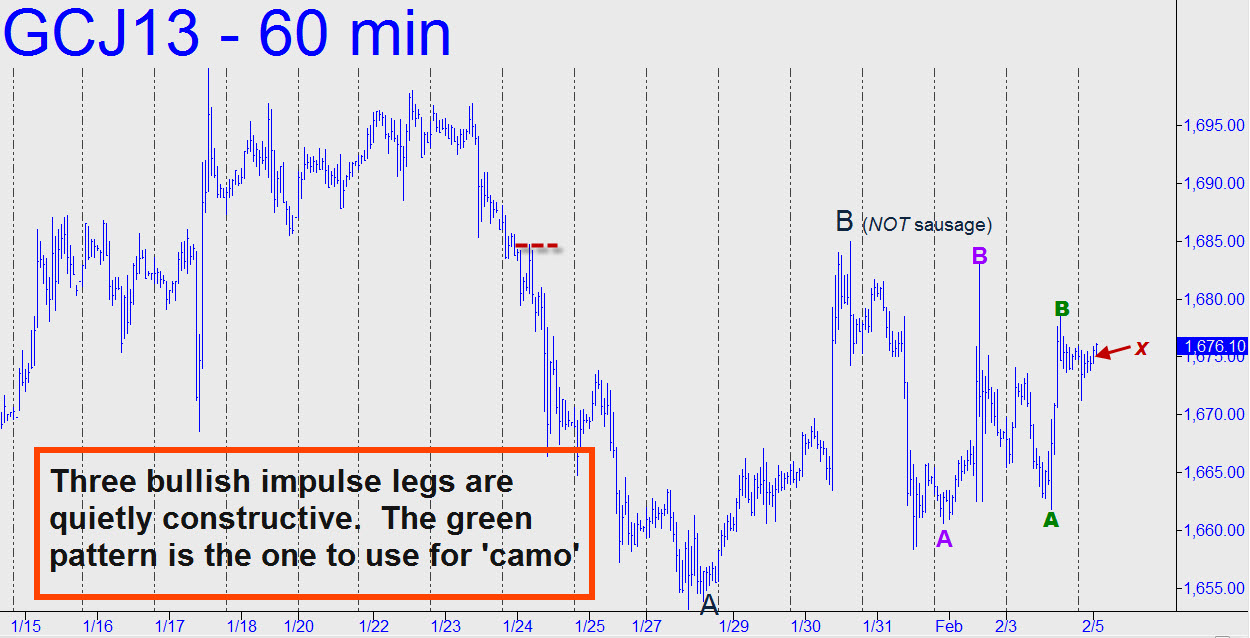 With Comex Gold now entering the second consecutive month of one of the most insufferably tedious dirges seen since the dawn of history, it’s probably a good time to notice the cluster of three bullish impulse legs on the hourly chart. They’re a mess, visually speaking, but when you sort out the picture bar by bar, there’s no denying that something quietly constructive is going on here. Accordingly, I’ll suggest leveraging the 1675.40 entry trigger of the pattern shown. It’s already been tripped, so you’ll need to create your own ‘camo’ trigger on a chart of lesser degree. The move targets 1688.00, with midpoint resistance at 1679.60, so you could loosen up if taking partial profits on the smaller pattern. _______ UPDATE (11:06 a.m. EST): Although Gold has since relapsed, the rally pattern I’d furnished could have been traded profitably without much stress. The move came within 1.00 of the 1688.00 target before a wholly meaningless decline to 1667 set in. My outlook remains unchanged.