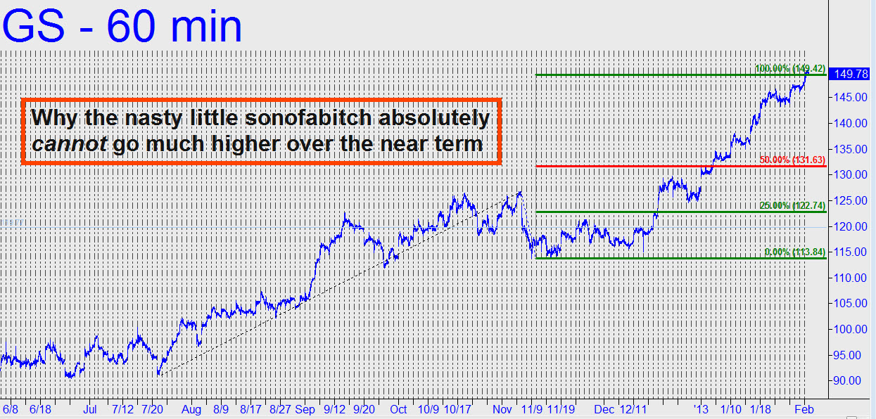 At least a dozen subscribers reported getting short in Goldman on Friday as instructed, but it wasn’t pretty. Because I had been unable to specify a limit on the bid for March 145 puts, your fills ranged from atrocious (i.e., 2.75) to fabulous (2.47). As is customary at Rick’s, I will use the worst price reported as our cost basis. I will also tack on 25 cents, since some of you stopped yourselves out when the puts traded down to 2.50 or so before I could update with advice to widen the stop to 2.25. You should stick with that stop-loss for now — and determine not to give a rat’s ass if Goldman forges still higher on Monday, as it well might. My gut feeling is that I would be absolutely dumbstruck if the stock were able to make much headway above the daunting Hidden Resistance I’d flagged at 149.42. No, as far as I’m concerned, Goldman shares absolutely MUST top somewhere near here if the market knows what’s good for it. Nevertheless, even though we “know” the stock can’t go “much” higher, at least not right away, we’ll use a stop-loss for the puts, since that’s the way we do things around here: always discipline, discipline, discipline.