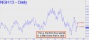 The futures have just tripped their third buy-signal in a year on the daily chart, and even though this may prove to have been a false alert, there is probably money to be made trading from the long side. The actual signal came at the 3.3673 point ‘X’ shown, so camouflageurs should focus on buy-side opportunities here. My hunch is that the move will get to p=3.503, at least, without stopping out those who have boarded thus far — a ‘successful’ trade by our definition. (A ‘winner’ is a camo trade that gets to ‘D’ or higher.)
