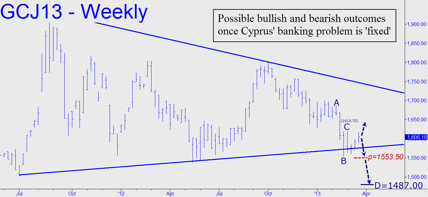 Gold could go either way, depending on how the Cyprus ‘solution’ is spun. My hunch is that the outcome will be bearish for gold, with the implication that the April contract will fall to the 1553.30 target shown. That’s a midpoint HP support, and if it’s decisively breached we could expect a further fall to its ‘D’ sibling at 1487.00. Alternatively, the most constructive outcome for bulls over the near term would be an upthrust that exceeds 1619.70 (see inset), the point C high of the pattern yielding the downside targets given above. As you can see, it would only take a small pop to get the April contract above that threshold. Were that to occur, bulls would have the benefit of the doubt on any pullback, since it would be merely corrective — and therefore buy-able — on the intraday charts. _______ UPDATE (March 25, 4:25 a.m. EDT): Gold is up a big 10 cents at the moment, obviously relieved that ‘only’ depositors and bondholders will take a hit from the Cyprus affair. The action so far would seem to corroborate the bearish outlook detailed above.
