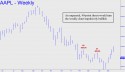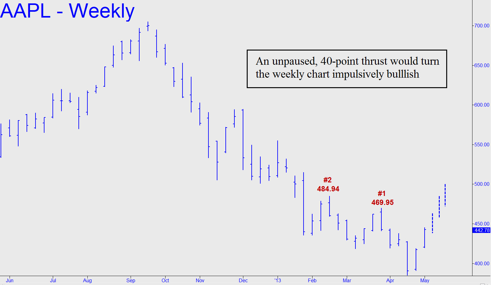 Apple is one of the few stocks that actually budged yesterday, for whatever reason. Bulls shouldn’t break out the bubbly just yet, though, since the stock will need to hit 484.95 to turn the weekly chart impulsively bullish (see inset). Moreover, the part of the rally between the two labeled peaks would need to be uncorrected in order to imply that the bear market in this stock is over. The trajectory of the rally is too steep to afford an easy entry, even by camouflage, but I’d suggest focusing on the 30-minute chart, where some serviceable ‘external’ peaks are visible, in search of buying handholds.