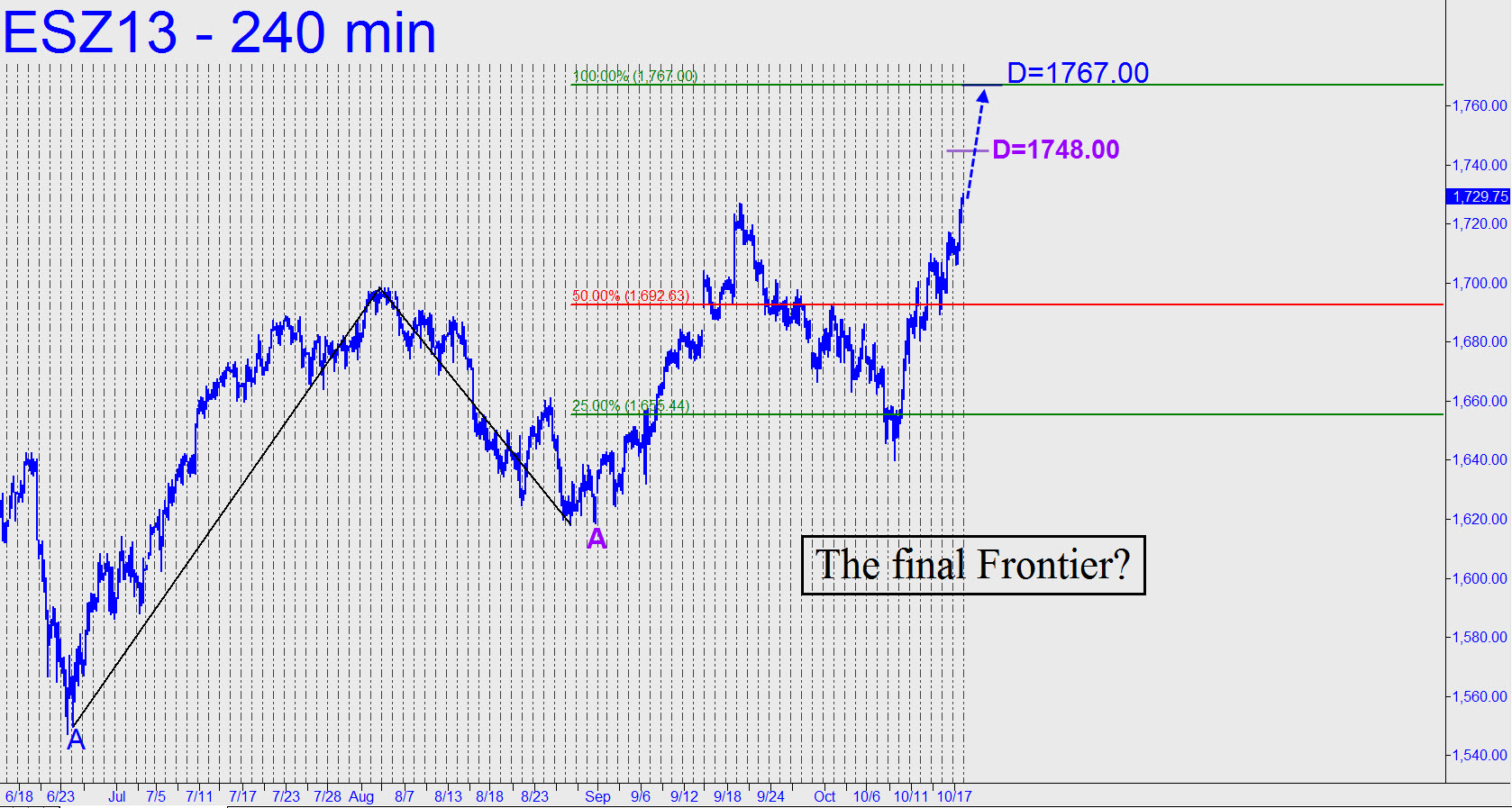 If the higher target is in fact easily surpassed, we will once again have underestimated the foolishness that has driven stocks ever higher since 2009 and which would now flout abundant evidence that the Republic itself is crumbling. (Click here…or…here, if you need to be convinced.) Traders can use a stop-loss as wide as 2.25 points shorting 1748.00 if they are reversing a long position entered at 1739.00 or lower, but we’ll play it by ear if there’s a trade at 1767.00. The chat room will be the place to be if you’re game to play.