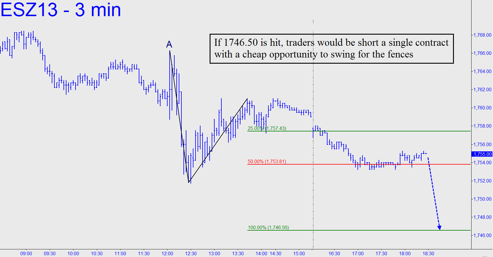 Be that as it may, I just conversed in the chat room with a subscriber who shorted this vehicle moments ago, in the early evening, using a ‘camo’ pattern on the 3-minute chart (see inset). The theoretical entry risk of 3.00 points per contract was more than we might typically abide when trading this vehicle with camouflage, but I am going to establish a tracking position nonetheless since it will allow me to follow-through on my very strong feeling that we have indeed caught a major top. Accordingly, based on price action that is occurring as I write these words, I’ll track two short contracts with a cost basis of 1760.75 that is well off the recent high. This implies four contracts shorted initially from 1757.25 (the green line shown), with two of them covered very quickly and for a small profit, as is our practice, at the 1753.75 midpoint pivot (red line). For now, a stop-loss is advised at 1761.25 for the two contracts that remain, o-c-o (one-cancels-other) with an order to cover a single contract at 1746.50. If successful, we’ll have one contract remaining to swing for the fences, effectively without risk. _______ UPDATE (11:07 a.m. EDT): About 20 minutes into the session, traders exited on a stop at 1761.25 with no gain or loss. The violent flailing around this morning could be a death rattle. In any case, we’ll keep trying, since I still think the recent high at 1773.25 is a good bet to have been the final high of the bull market.