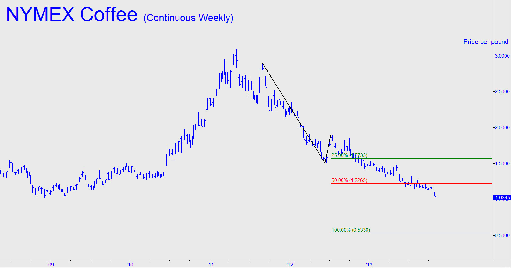 From a technical standpoint, his theory looks quite solid. The weekly chart (see inset) implies that a pound of coffee currently trading on NYMEX for $1.03 is about to fall by half. If the futures were in fact to achieve the Hidden Pivot target of 53 cents, that would represent an 83% drop from 2011’s all-time high of $3.08. Coffee lovers may have something to look forward to, but they should be careful what they wish for, since the implication of coffee beans selling for 50 cents a pound is that the world by then will be chest-deep in a deflation of falling wages, plummeting asset values and significantly lower corporate profits.