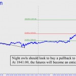 If you’re successful on the long side of this play, you should reverse the position at 1840.50 and go short with an 1842.25 stop-loss. If you hold no position if and when 1841.00 is closely approached, try shorting a single contract at 1840.50, stop 1841.50.