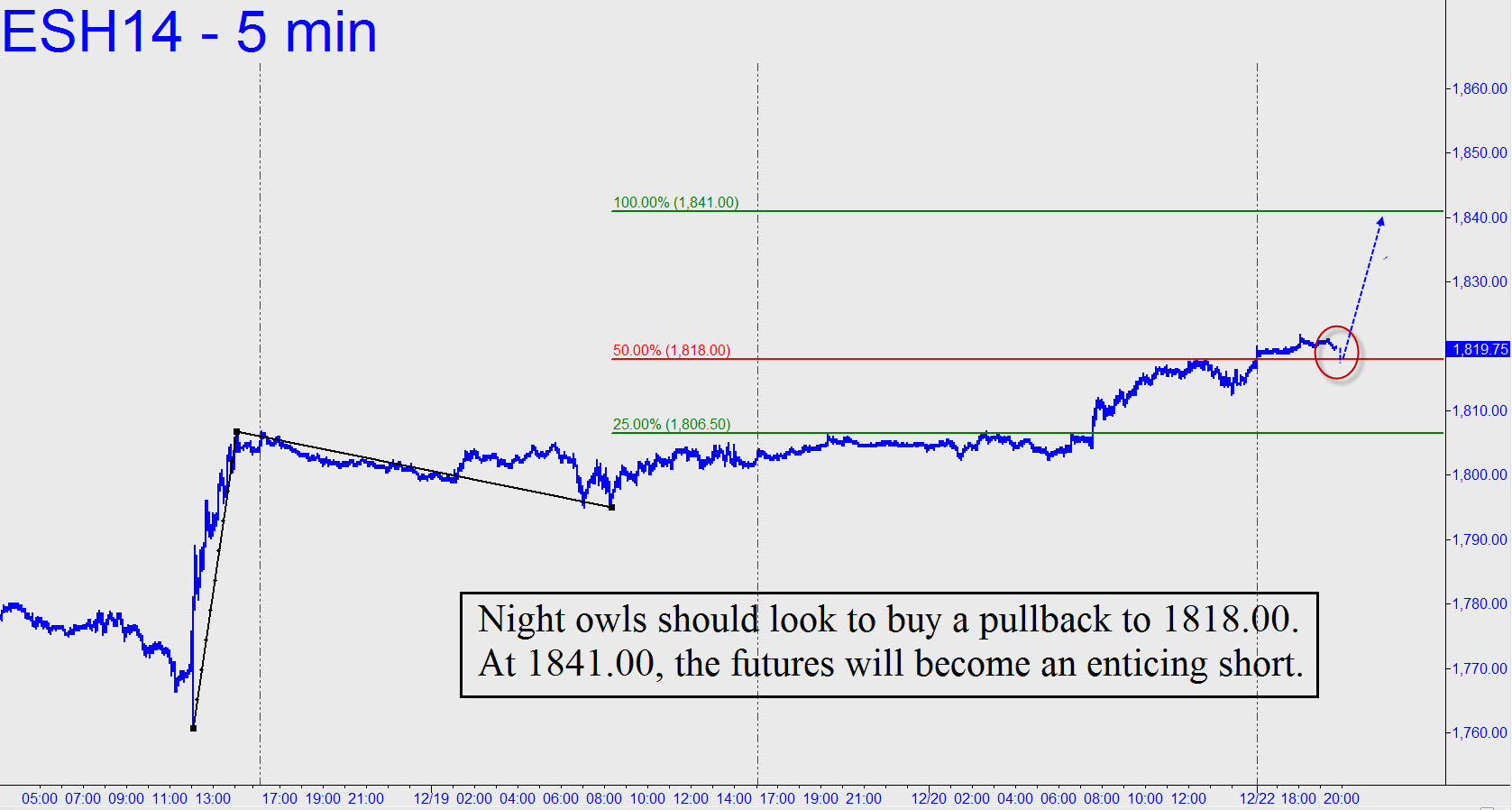 Subscribers who used the 1818.00 target I’d proffered in the chat room Friday to get short could have covered the position less than an hour later for as little as 1812.50. (One subscriber who played it strictly-by-the-numbers reported shorting 34 contracts at 1816.25 and covering them all at 1814.50. The gain would have worked out to about $2975.) Near the end of the session, I further advised keeping 25% of the original position to swing for the fences. But that, too, should have been covered, since the futures traded up to 1820.00 on Sunday night’s opening bar.