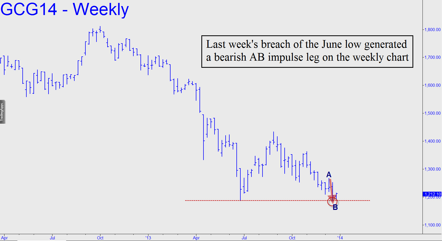 With last week’s low, the June 28 bottom has been breached. The selling also generated a bearish impulse leg (see inset) on the weekly chart with a new bear-market low that will have caused many bulls to throw in the towel. That is the reason for this morning’s modest rally: stops got run beneath the June low, lightening the futures of erstwhile profit-takers on this bounce. It will need to be quite strong — at least $50-$60, as noted here earlier — to suggest that a major low is in and that this is not merely a dead-cat bounce. In purely technical terms, it would take a rally of about $150 to turn the weekly chart bullish (for the first time since August). Specifically, a print at 1362.40 is needed, and the rally would have to be uncorrected on the weekly chart once it exceeds 1267.50.