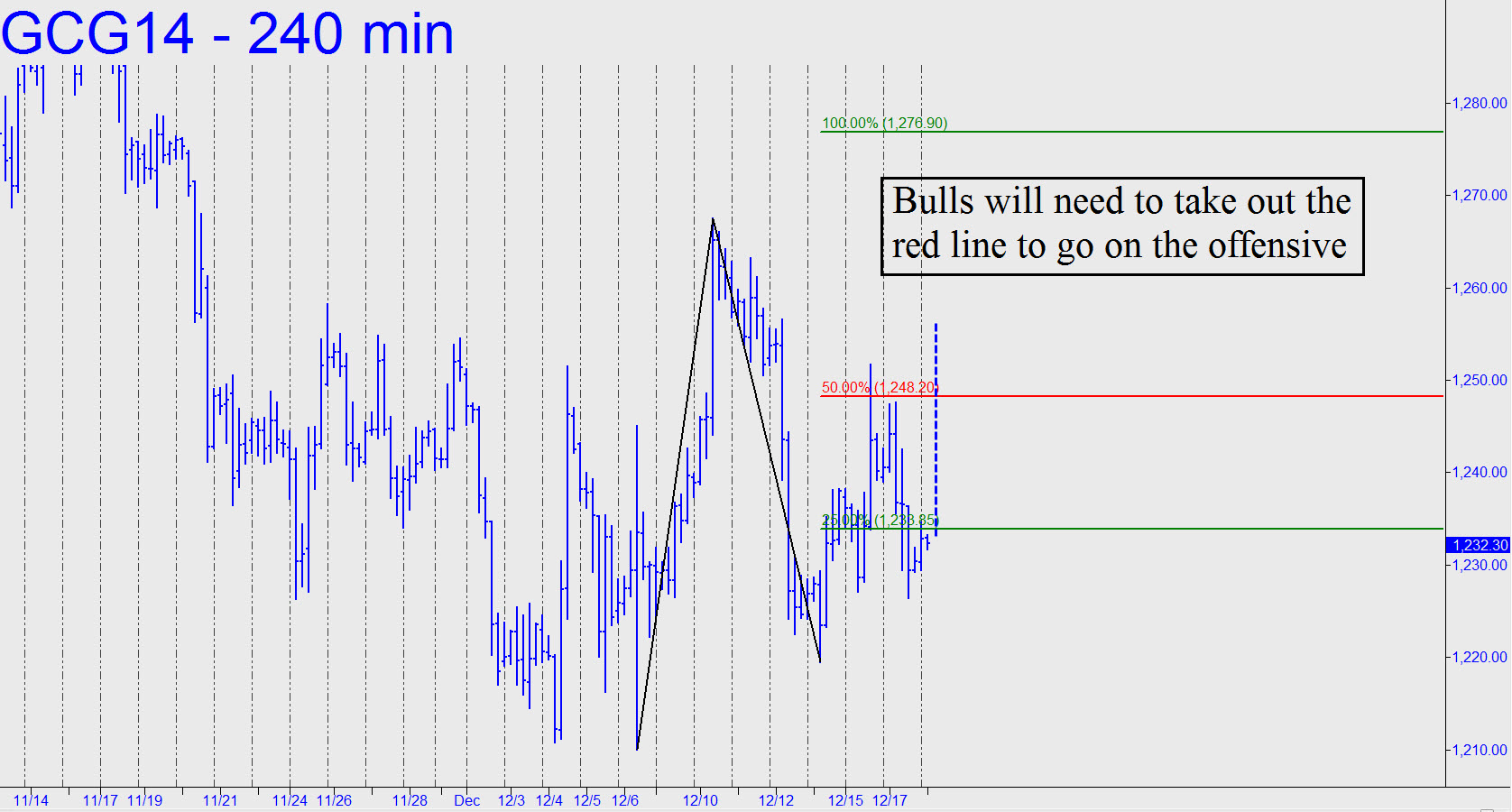 The number to beat is 1248.20 (newly revised from 1252.00), a midpoint resistance whose decisive breach would signal more upside over the near term to at least 1276.90. Despite the disappointing price action of the last three days, bulls still hold an edge — one that will remain intact unless December 6’s 1210.10 is penetrated to the downside. Otherwise, an intraday high of 1252.30 or better, or a two-day close above the 1248.20 red line, would provide the encouragement we’ve been looking for.