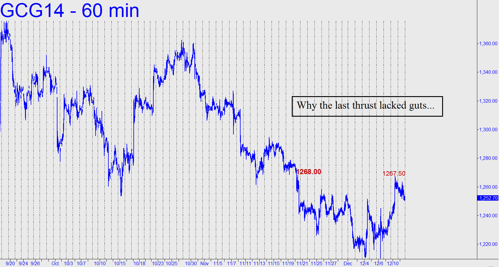 We’ll grudgingly give bulls the benefit of the doubt for now, since the pullback from Tuesday’s high looks like a classical consolidation. However, there is no getting around the fact that bulls lacked the cojones to push past the external peak at 1268.00 (see inset) on the first try. This display of timidity is almost certain to have implications going forward, but at the very least it suggests that gold’s true believers lack the energy or the conviction to end a bear market that is now in its third year. The futures remain a bull trade at the moment nonetheless, and traders should look to do their buying on a pullback from just above 1253.50. That’s equal to a small peak made near the end of Wednesday’s session that’s easily visible on the 5-minute chart. The relevant point ‘A’ low would be 1252.00 (6:25 p.m. EST). ________ UPDATE (December 12, 9:44 a.m. EST): Gold has gotten dumped for the umpteenth time, so far retracing a little more than 70% of the recent, apparently gratuitous rally. If you need a slender reed of hope to cling to, the 1212.10 low is still intact. A longstanding bear-market target at 1139.50 remains viable. This corresponds to the 1125 target given for the December contract. _______ UPDATE (December 13, 12:04 a.m.): As long as the 1210.10 low holds bulls are entitled to the benefit of the doubt. But they’ll need a ‘booster rally’ of at least $14.40 to get out of crisis mode, and exactly twice that to set up a recovery next week. Assuming such a rally were to occur from no lower than yesterday’s 1222.60 bottom, that would imply that 1237.00 is where encouragement begins, and 1251.50, a sigh of relief.