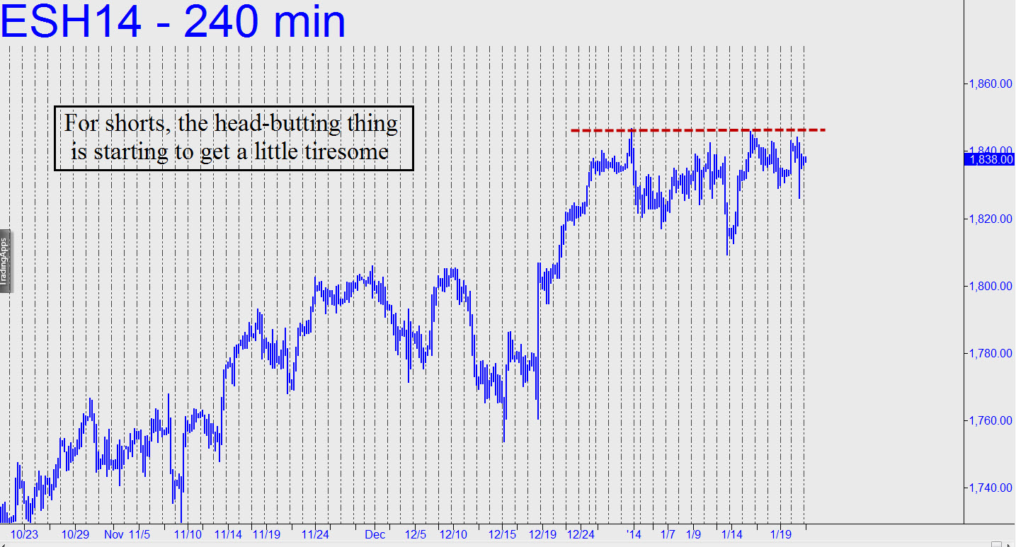 If you got short on New Year’s Eve near the major Hidden Pivot target at 1846.75 discovered by chat-room regular ‘Pietdup’, you should be starting to see the problem by now. Clearly, nailing the all-time high within a single tick confers no license to simply forget about one’s short position while it racks up profits over days, weeks and months. In fact, the futures have been head-butting the high nearly every other day lately, following up with swoons that will have lulled many a bear into thinking things were going swimmingly.