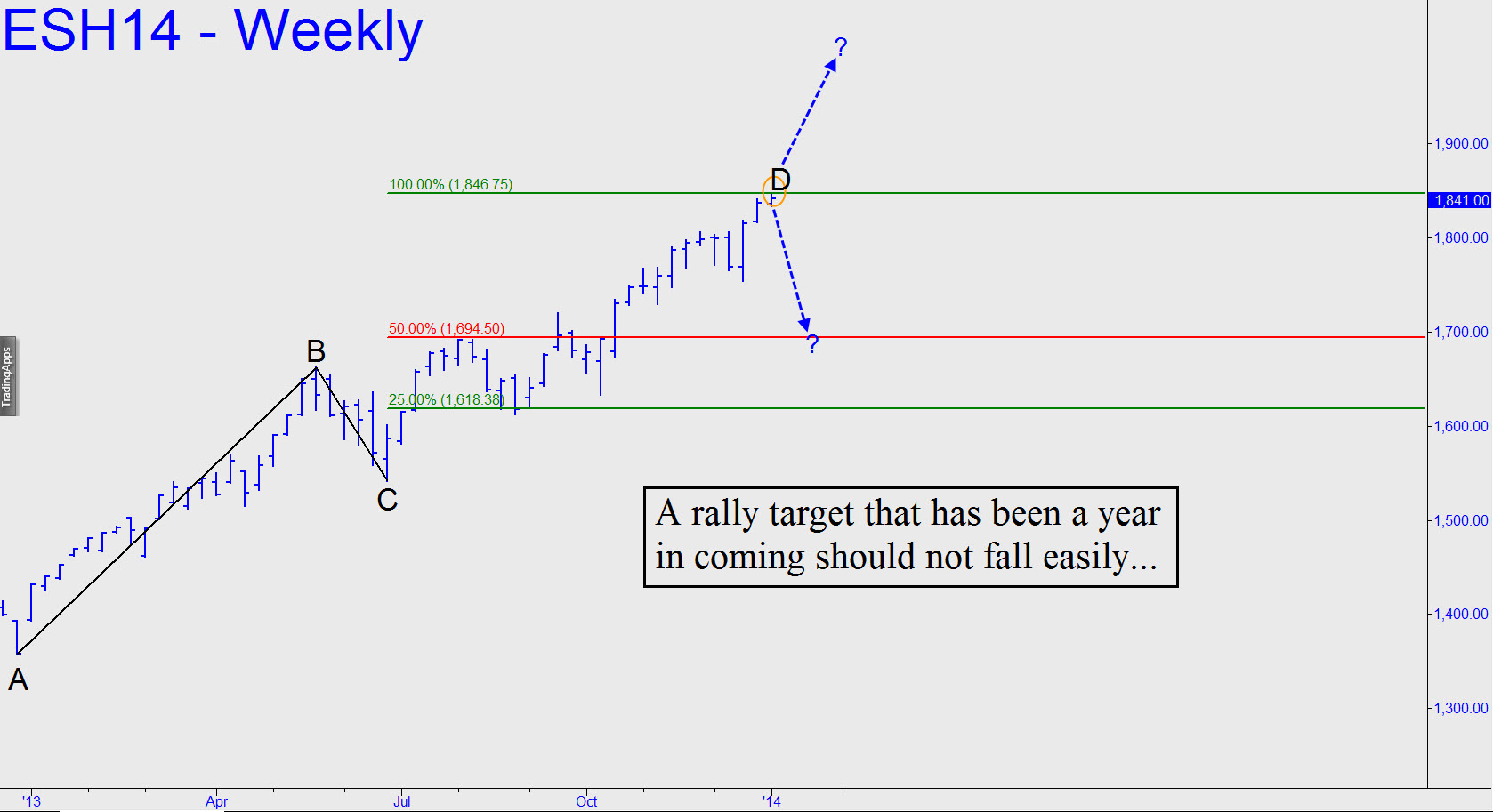 So what now? I expect this vehicle to continue higher in the weeks ahead. However, if the rally were to launch in the first hour or two of Thursday’s session, that would be warning bears either to step aside or to go with the flow, since the Hidden Pivot at 1846.75 is not exactly chopped liver. In fact, the target has been more than a year in coming, suggesting it is capable of putting up a fight for perhaps a good 5-7 days before falling to the bullish horde. Plan accordingly.