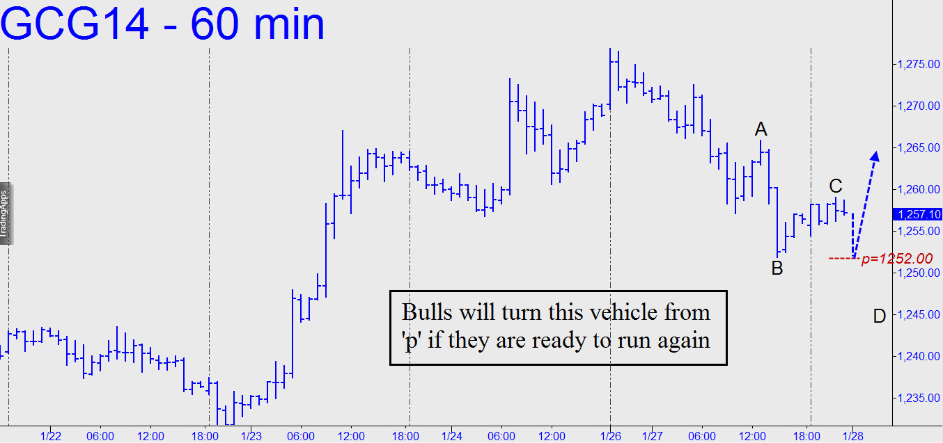 Monday’s ratcheting decline turned an ebullient hourly chart into a mixed picture, with bulls and bears locked in a duel. The former should still be presumed to hold an edge, since the $28 selloff from the recent high amounts to a so-far healthy, 0.618 correction of a $45 rally. It was fully expected, since we were using a 1278.90 target that came within nine ticks of nailing the last top, 1279.80. Looking ahead, we’ll be better able to gauge the power of the selling by monitoring midpoint supports like the one shown. If bulls are ready to get back in gear, we should see abc corrections go no lower than their respective ‘p’ Hidden Pivots. Alternatively, if this or any other minor abc downtrend overshoots not just p, but the D target, infer that bears will continue to dominate, at least for the near term.
