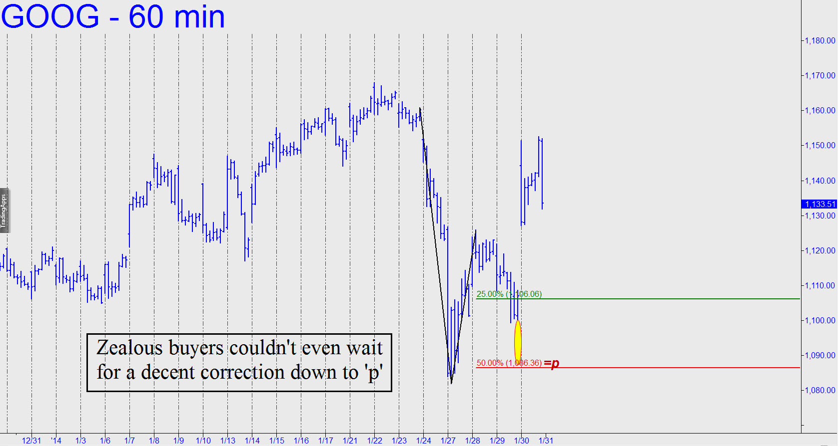 At one point yesterday, virtually all of the hot stocks and high-fliers that I track were ‘in-the-green’. In saner times, when shares were driven by actual investors rather than by algorithms programmed to throw limitless sums of Other People’s Money at the market, we might have expected such an excess of overbought zeal to produce a nasty reaction. Not any longer, though. Check out GOOG’s hourly chart (inset), which shows buyers tripping over themselves to avoid missing the next monster leap.