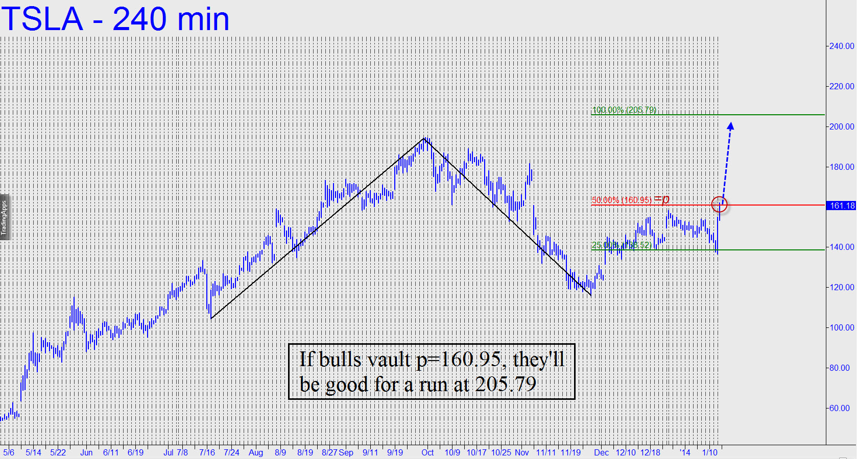 The whack-jobs are back! Tesla shares exploded to 162 on Tuesday for a nearly 20% gain. After that kind of performance, who even remembers why the stock got pounded down to 116 in November? Bulls should be careful just the same, since all it would take for some crook to manipulate this stock into a steep dive is a YouTube video of flames shooting out from under some Tesla hood. It’s been a while since that has happened, and that could explain why DaBoyz decided it was time to goose the stock. Notice, however, that the short squeeze, vicious as it was, failed to propel TSLA much past the midpoint pivot at 160.95. The actual high occurred $1.05 above the resistance, but that’s not quite enough of an overshoot for us to assume that a run-up to its ‘D’ sibling at 205.79 is a done deal. However, if the stock were to close for two consecutive days above 160.95, I’d infer that a cruise to the higher number is no worse than an even-odds bet. _______ UPDATE (February 10): The stocks deft handlers — racketeers and erstwhile child molesters with Ivy League credentials — have jacked up the stock by $14 today on who-cares-what-news, punching it to $189 on an opening-bar short-squeeze. The so-far high at 199.30 leaves little ground to be covered to achieve the 205.79 target flagged here nearly a month ago, when the stock was trading nearly $40 lower. One thing’s for certain: When DaSleazeballs have found the optimal price at which to dump stock into the eager hands of widows, pensioners and orphans, we can expect news of yet another flaming Tesla to trigger a precipitous dive and a new cycle of accumulation.