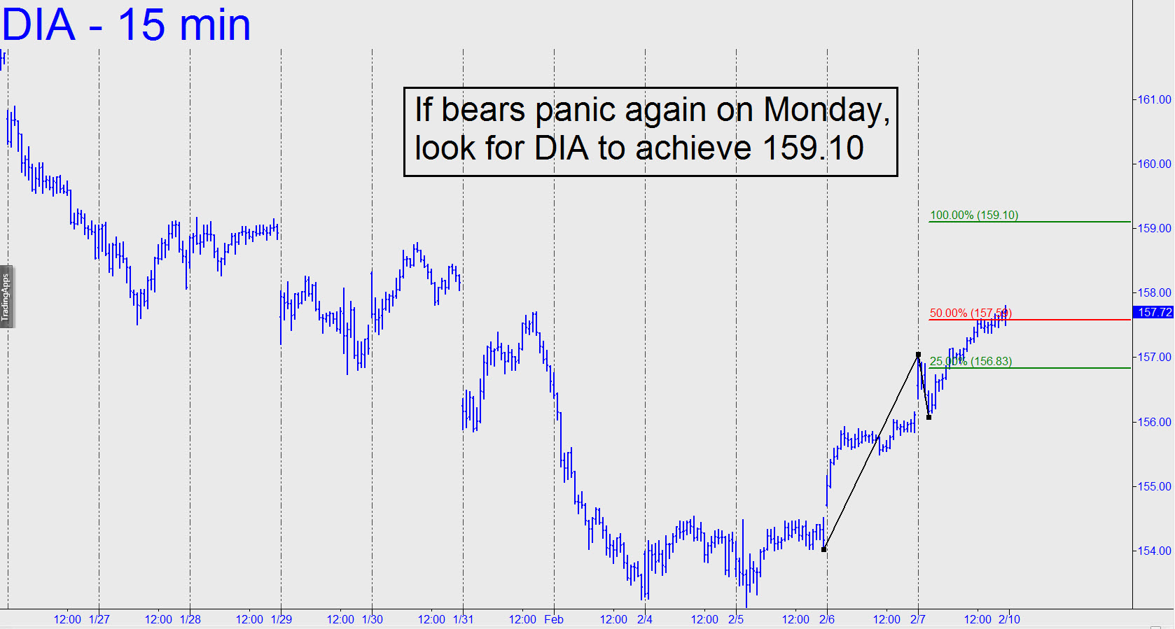 I advised taking profits on eight of those contracts at two different intervals — a tactic that would have locked in a gain of at least $1280 no matter what DIA did subsequently. However, holding onto four contracts until Friday was a riskier gamble. Although the puts could have produced an additional gain of $1200 had the DJIA rallied less than 200 points after bottoming Wednesday morning, the blue chip average in fact rallied 450 points. Even so, subscribers could have added $640 to the gain on the overall position if they sold the spreads at the lower end of the range I’d flagged the night before. This was easily possible when the Dow dropped nearly 100 points Friday after squeezing the bejeezus out of bears during the opening minutes of the session.