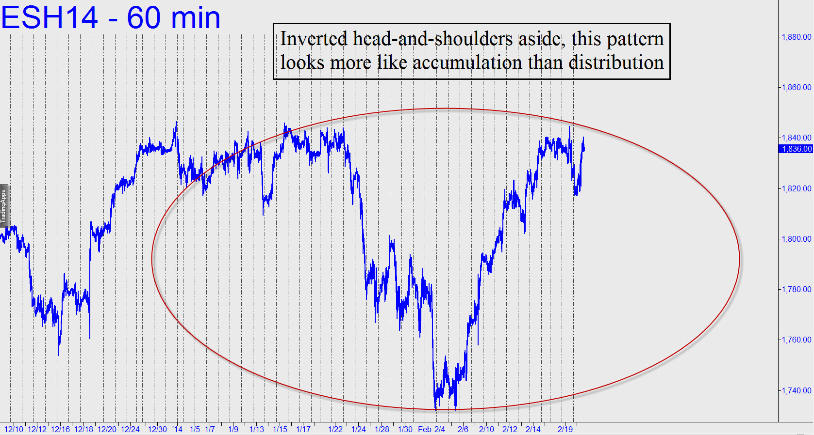 I don’t pay much attention to head-and-shoulders patterns because they are everywhere one wants to see them. Even so, at the intuitive level, the inverted h&s shown in the accompanying chart looks more like accumulation than distribution. Under the circumstances, it seems very likely that the futures will soon ascend to new record highs, even if few of my fellow forecasters seem eager to go out on a limb with a specific prediction. The weekly chart suggests 1945.00 is possible, but the March contract would first need to blow past the 1838.50 ‘midpoint pivot’ associated with that target.