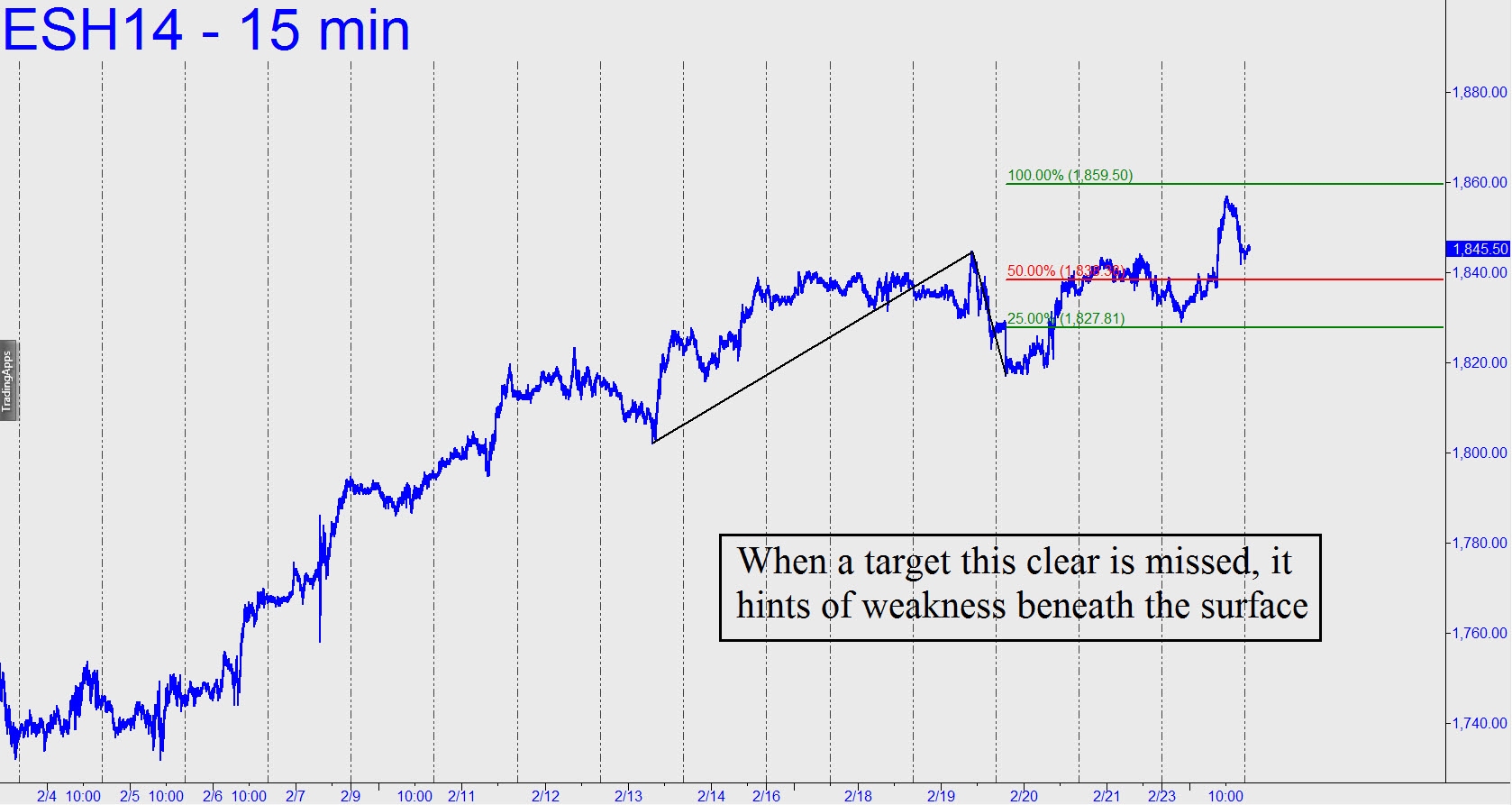 This will be more easily accomplished if DaBoyz can keep the correction shallow, but it is they who will be on the ropes if this vehicle takes out yesterday’s 1830.25 low in the process. Under the circumstances, you should trade with a bearish bias, since the intraday charts are bearishly impulsive. The potentially tradable pattern I see at the moment, using the 3-minute chart, comes from the following coordinates: a= 1350.25 at 3:48 p.m. EST on 2/24; b=1842.00; and tentative c=1846.25. Please note, however, that it would take but a 1.00-point rally to generate a bullish impulse leg on the 3-minute chart, so scalpers should consider both sides of the opportunity.