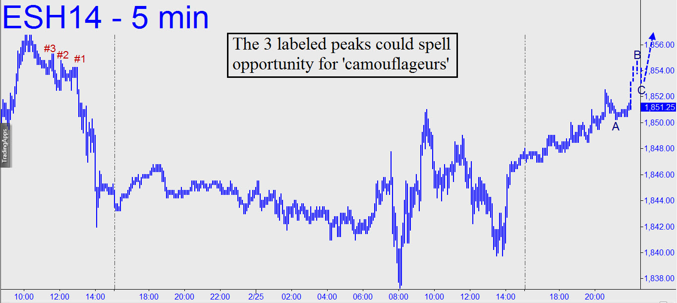 Bears got the worst of it yesterday after a promising opening that saw the Dow fall about 60 points. Alas, the respite was short-lived, and the remainder of the day amounted to a herky-jerky rally that probably annoyed shorts more than scared them. That mood may last until the opening bell, but with new record highs just five points away, don’t expect bears to feign zen calmness for long. Traders looking to board ahead of the next upthrust should look for external peaks to leverage on the 5-minute chart. I’ve labeled a few just so you get the idea.