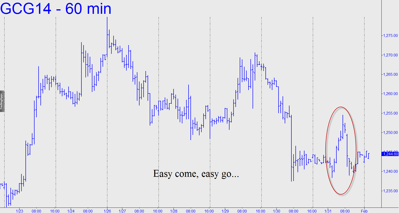 Gold bounced from a promising midpoint pivot in almost exactly the way I’d sketched. Unfortunately, its $16 leap was short-lived, ending as it so often does before the regular Comex session got rolling. Thereafter, the futures retraced to within an inch of the would-be launching pad, near where they continued to languish Sunday night. We therefore begin the new week defensively, albeit open to the possibility of a rally strong enough to turn the hourly chart as bullish as it was last Monday. (That would require a print at 1257.00.) Keep in mind that buyers got sandbagged on last week’s opening bar, which proved to be the highest price of the week.