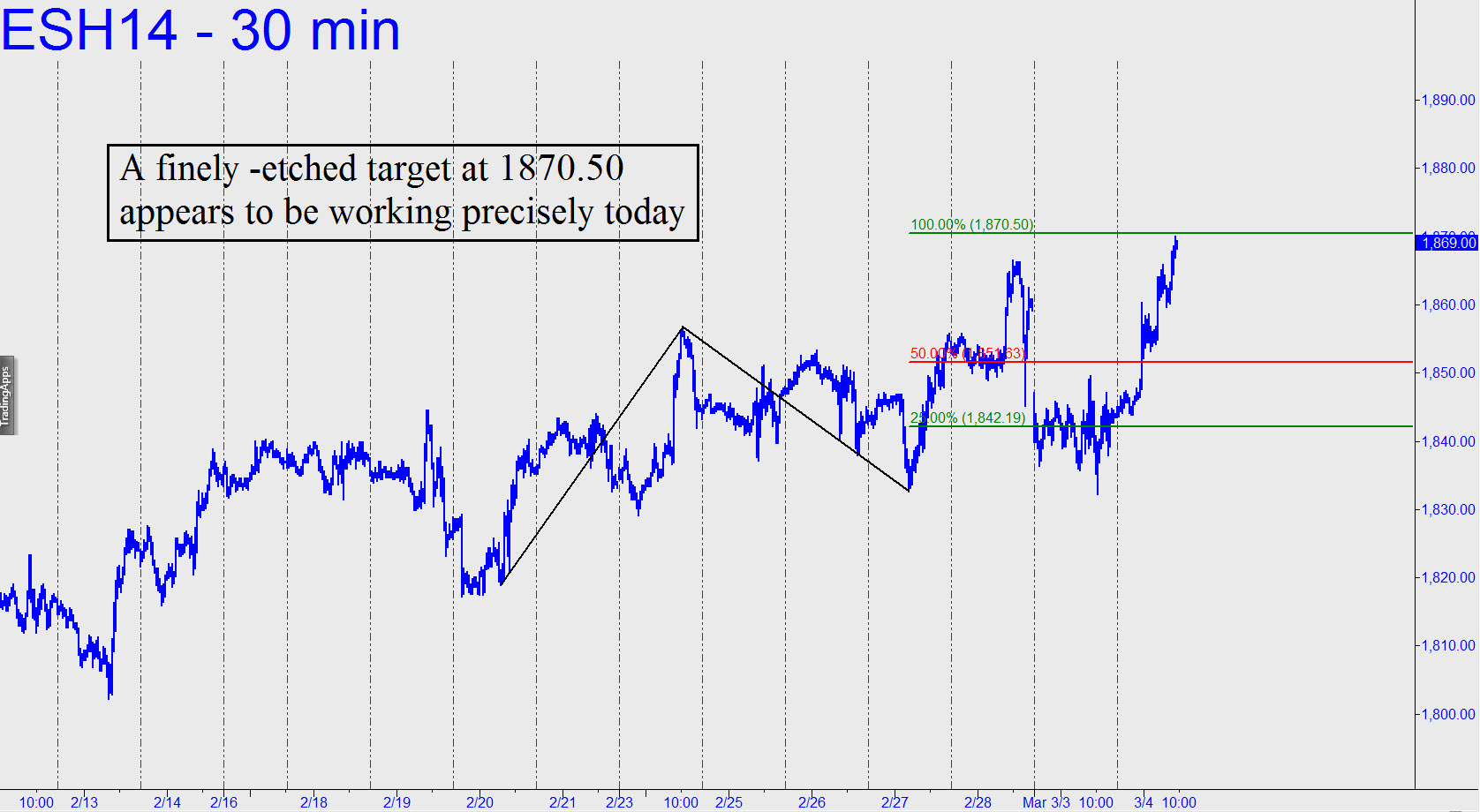 Someone just queried me in the chat room to ask whether previously given targets for this vehicle and the Mini-Nasdaq were still valid. The answer is yes, and, as you can see in the accompanying chart, the Hidden Pivot at 1870.50 is working very precisely today. It is shortable, but if the futures forge higher, the next logical stop would be 1879.75, a target that comes from shifting ‘B’ upward to Feb 28’s 1866.50.
