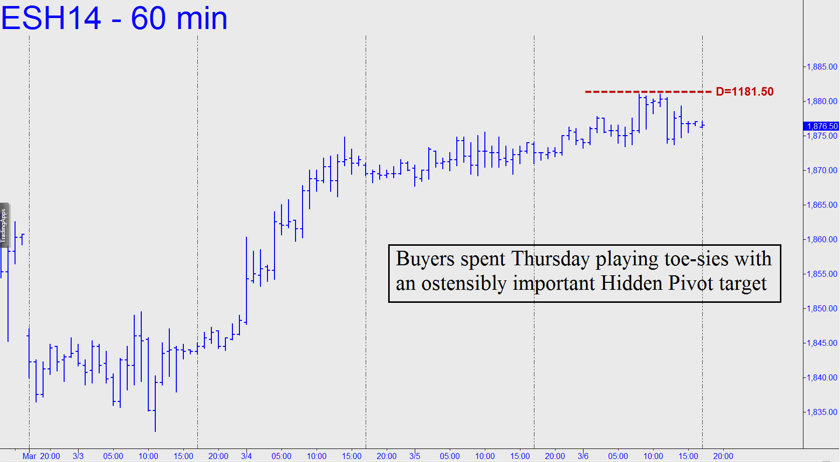 I’ve broached a 1945.00 target if DaBoyz should bully their way to new highs in the week ahead. Although I am unable to imagine a good reason for such an explosion, I’ve learned over the last five years that no reason is needed. More immediately, since the E-Mini ended the day in the throes of a pattern that was impulsively bearish on the 15-minute chart (targeted on 1872.50, where A=1880.50 at 1:10 p.m. EST), night owls should trade with a bearish bias. (Please note, however, that this endeavor could prove dicey, since bears are having an awful struggle holding this little sonofabitch down in after-hours trading.) Another tactic would be to bottom-fish the target — or ‘a’ target — with the goal of racking up sufficient gains on any ensuing rally to cushion the stop on the next short.