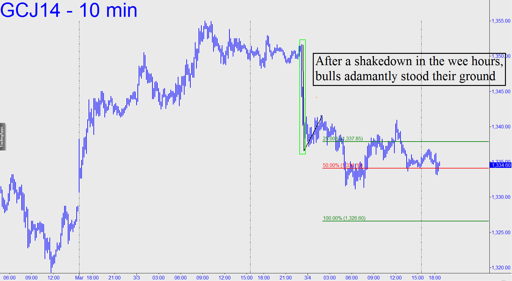 Considering that equities were in a rabid, take-no-prisoners short-squeeze yesterday, and Ukraine was on its way to becoming yesterday’s news, gold held up pretty well. The scumballs who thrive on beating it down at every opportunity had to accomplish the task in under 30 minutes yesterday — in the dead of night. Pretty sleazy. And what weakness we saw thereafter was not weakness at all, but rather, bulls saying, Make my day. There is immediate downside risk to at least 1326.60 nonetheless (see inset), but bulls have stood their ground so well here that it’s difficult to imagine the selling will get much worse than that. Camouflageurs looking to bottom-fish should monitor charts of 5-minute degree or less near the red and green lines shown. _______ UPDATE (March 6, 10:47 a.m. EST): Gold has popped for a $16 rally this morning after having gone no lower than 1331. If and when it blows past the 1349.10 midpoint pivot, we can infer more upside is coming to at least 1366.90 over the near term. (FYI, the pattern displays nicely on the 30-min: A=1319.30 on February 28.)