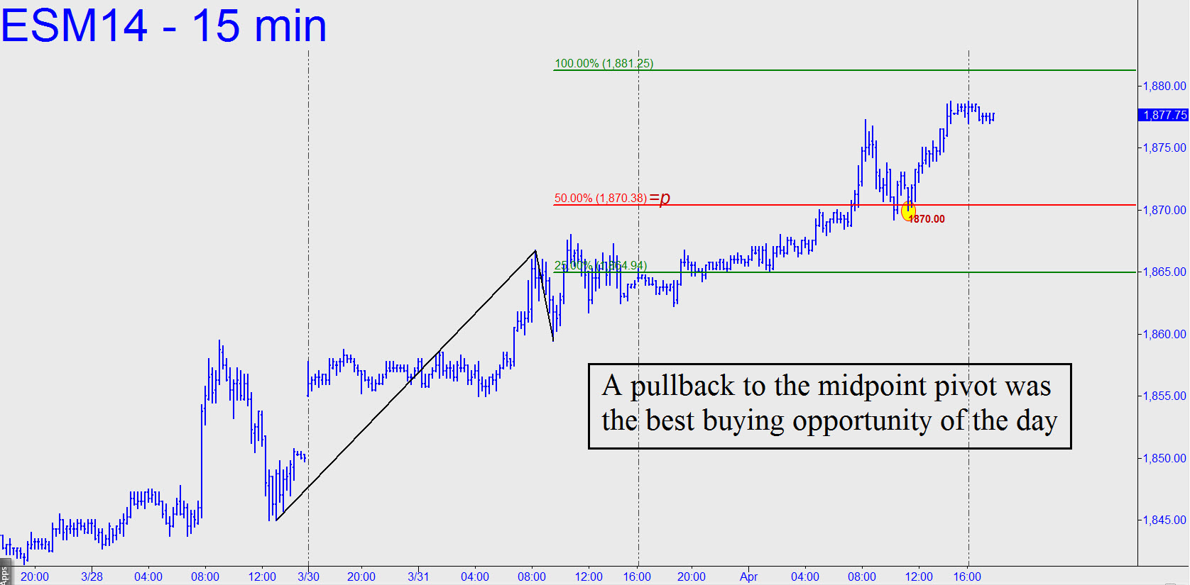 Traders looking for actionable advice in real time might want to consider following me on Twitter by clicking here. Anyone dialed in yesterday would have received the following tweet at 1:16 p.m. EDT: ‘E-Mini S&P: So-far high somewhat shy of still-good 1881.25 target. Pullback to Hidden Pivot ‘sibling’ at 1870.25 is spec buy w/ tight stop.’ As you can see in the accompanying chart, the futures pulled back to exactly 1870.00 before embarking on a 9.50-point rally that could have been worth as much as $950 to anyone long just two contracts. Ordinarily I would now suggest reversing long positions and going short at the 1181.25 target, which was missed by 2.50 points. However, although the target itself remains viable, any hysterics overnight or at the opening bell could make it tricky to squeeze off the short with the very tight stop-loss that I usually advise.