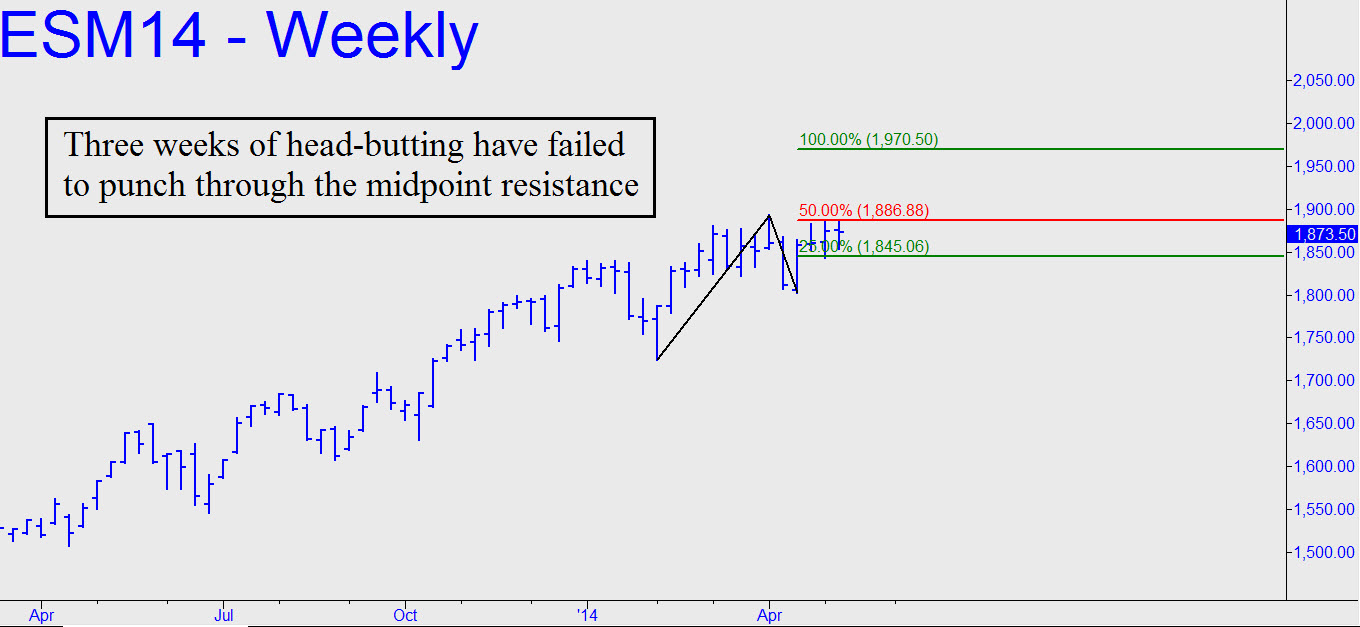 Three weeks of relentless head-butting have failed to punch past the midpoint pivot resistance at 1887.00 shown in the chart. My gut feeling is that bulls will eventually succeed — with crucial help, as always, from panicky short-covering. In the meantime, however, the futures may have to go lower first to get the running room they need to accomplish this modest feat. Whatever the case, a two-day close above the pivot would signal their readiness, and traders should regard such an occurrence as a low-risk buying opportunity. Upside potential would be to 1970.50, the ‘D’ target shown. That would equate to a Dow rally of about 800 points from current levels — still a tad shy of the 17622 bull-market target we’ve been using for quite a while.