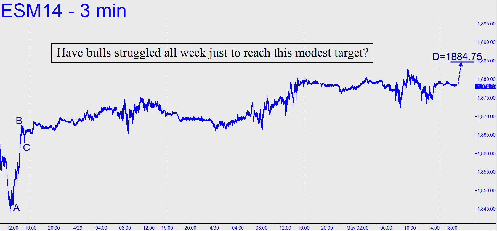 Zzzzzzzzzzzz. Sometimes after a quick rally-and-retracement the follow-up leg takes so long to reach its Hidden Pivot target that we forget it’s there. Make no mistake, however: The 1884.75 target shown is what the futures appear to have struggled all week to achieve (or perhaps exactly 1894.00, an alternative target). Yesterday’s gratuitous swings brought the June contract inches closer to this very modest goal, presumably so that the week can end with enough excitement to put a spring in our step and a song in our heart as the weekend begins. Note that despite the surly pointlessness of yesterday’s price swings, the futures managed to exceed a bullish threshold I’d mentioned earlier at 1882.50 by a single tick. That made the four-hour slog that followed ostensibly corrective and therefore, at least in theory, a buying opportunity. However, because four such opportunities died trying to get off the launching pad yesterday, I’m not going to pretend there might be something interesting for you to do today. Instead, we’ll let the press tell yesterday’s story in their inimitable way, avoiding as always the inference that the stock market 90% of the time is a dead zone, as bereft of meaningful activity as a tumbleweed farm. _______ UPDATE (10:52 a.m.): On the hourly, a major target at 1970.50 is coming into focus. (A= 1725.25 on 2/5/14). This pattern has a midpoint resistance at 1287.00, which is where ES appears to be stalled.